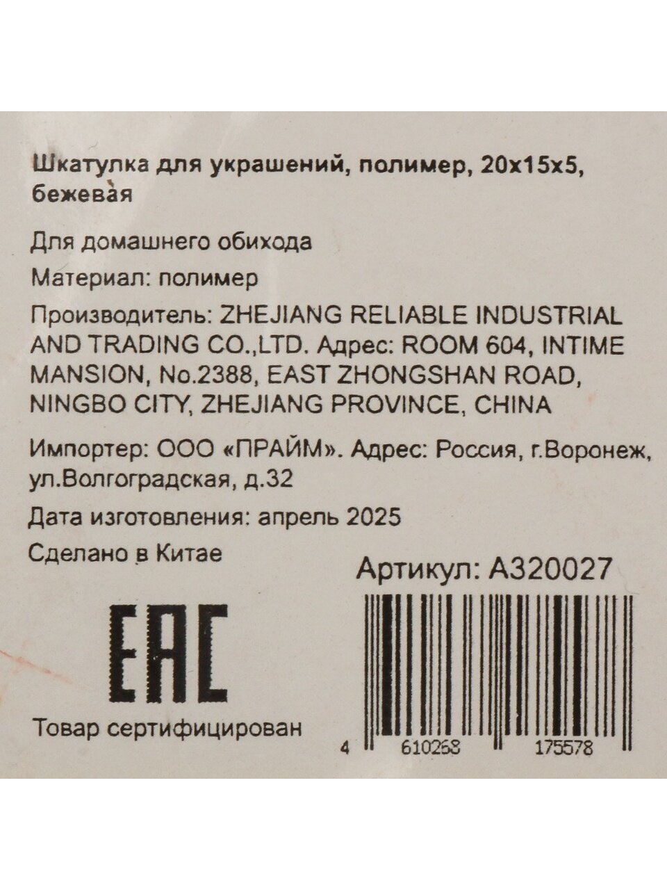 Шкатулка для украшений из полимера размером 20х15х5 см – стильное решение для хранения любимых аксессуаров. Элегантный бежевый цвет гармонично впишется в интерьер спальни или гардеробной. Организация украшений станет легкой и удобной, а изделия всегда будут под рукой и в порядке.