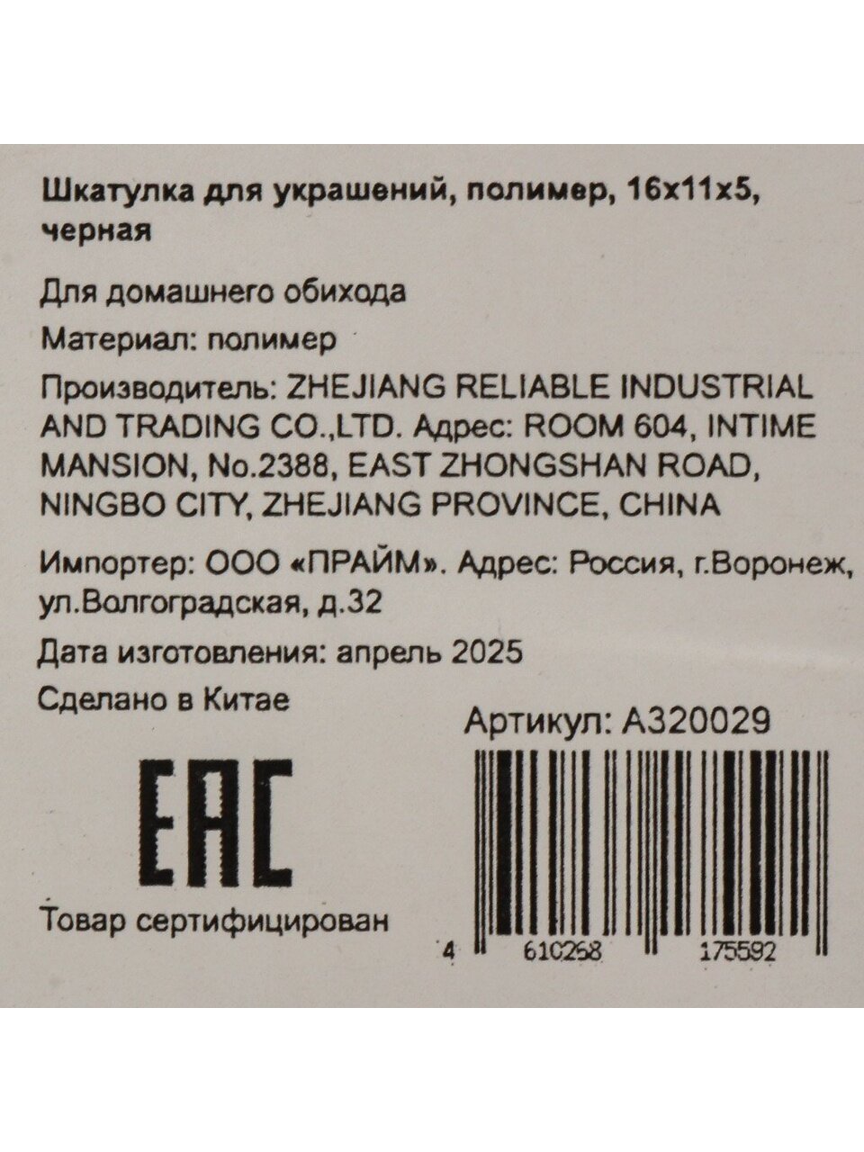 Стильная шкатулка для украшений из полимера станет отличным выбором для хранения любимых аксессуаров. Компактные размеры 16х11х5 см позволяют удобно разместить изделие на туалетном столике или в шкафу. Черный цвет гармонично впишется в любой интерьер и подчеркнет элегантность пространства.