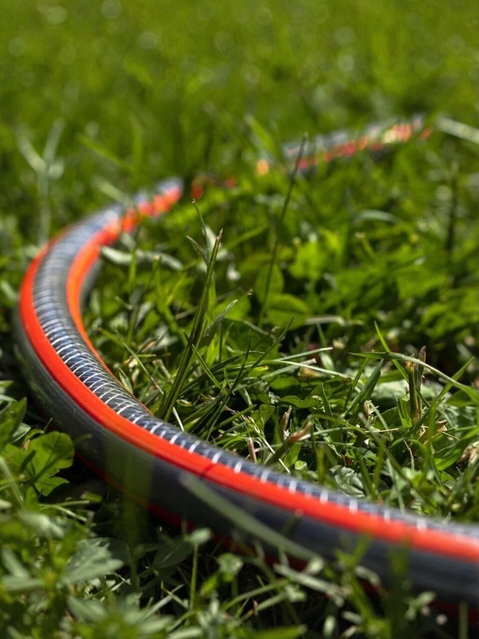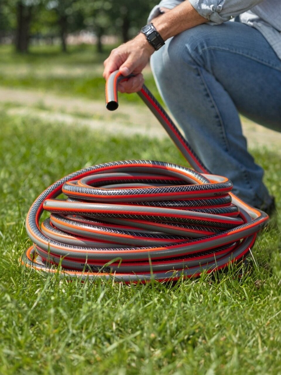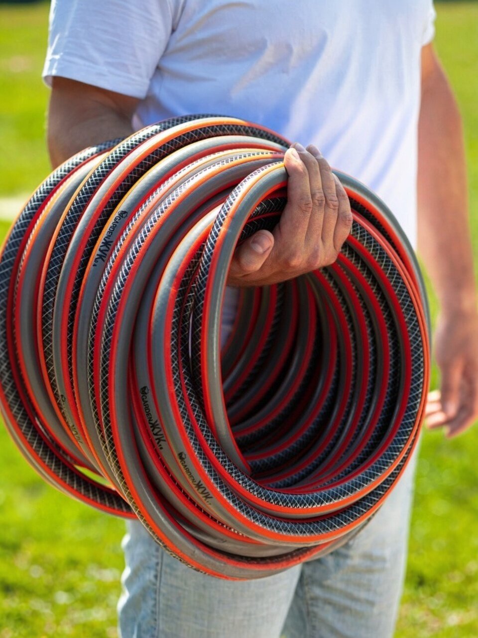 - Длина шланга составляет 25 метров, что делает его идеальным инструментом для полива садовых участков и транспортировки различных жидкостей, включая пищевые продукты.