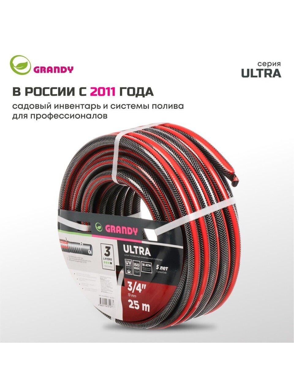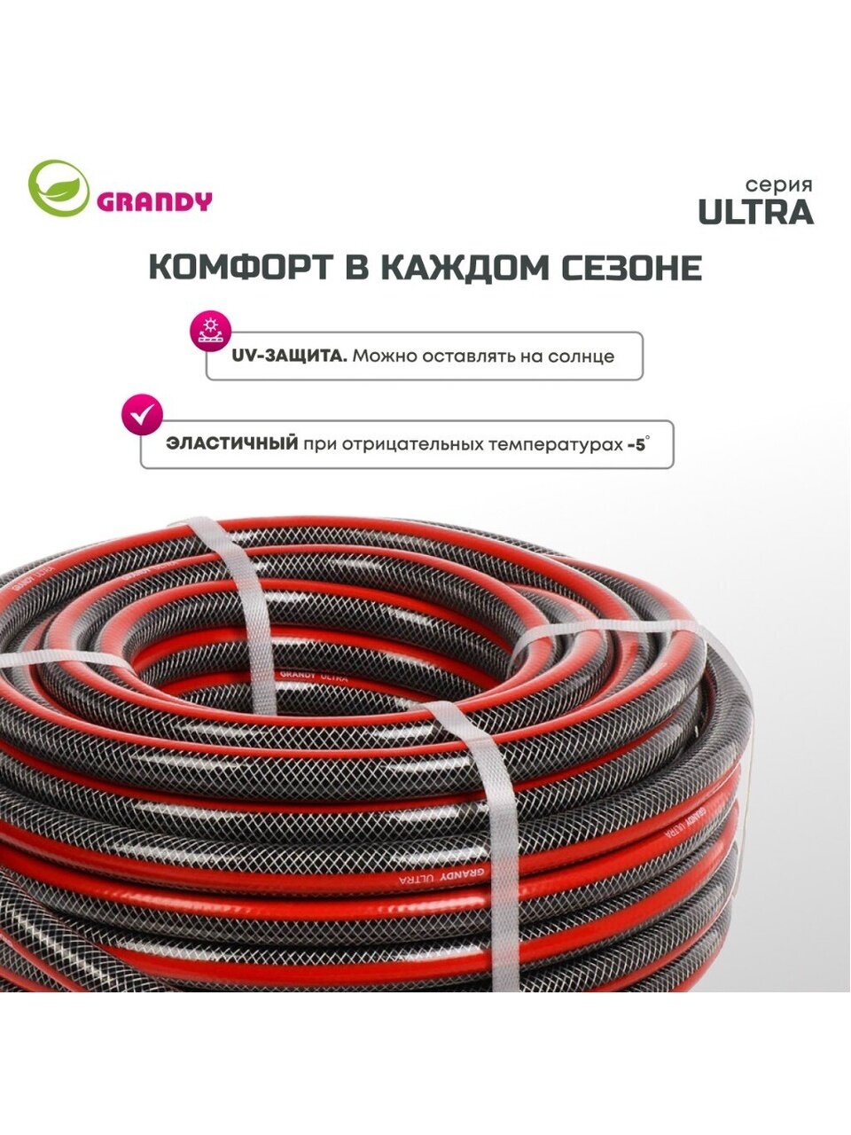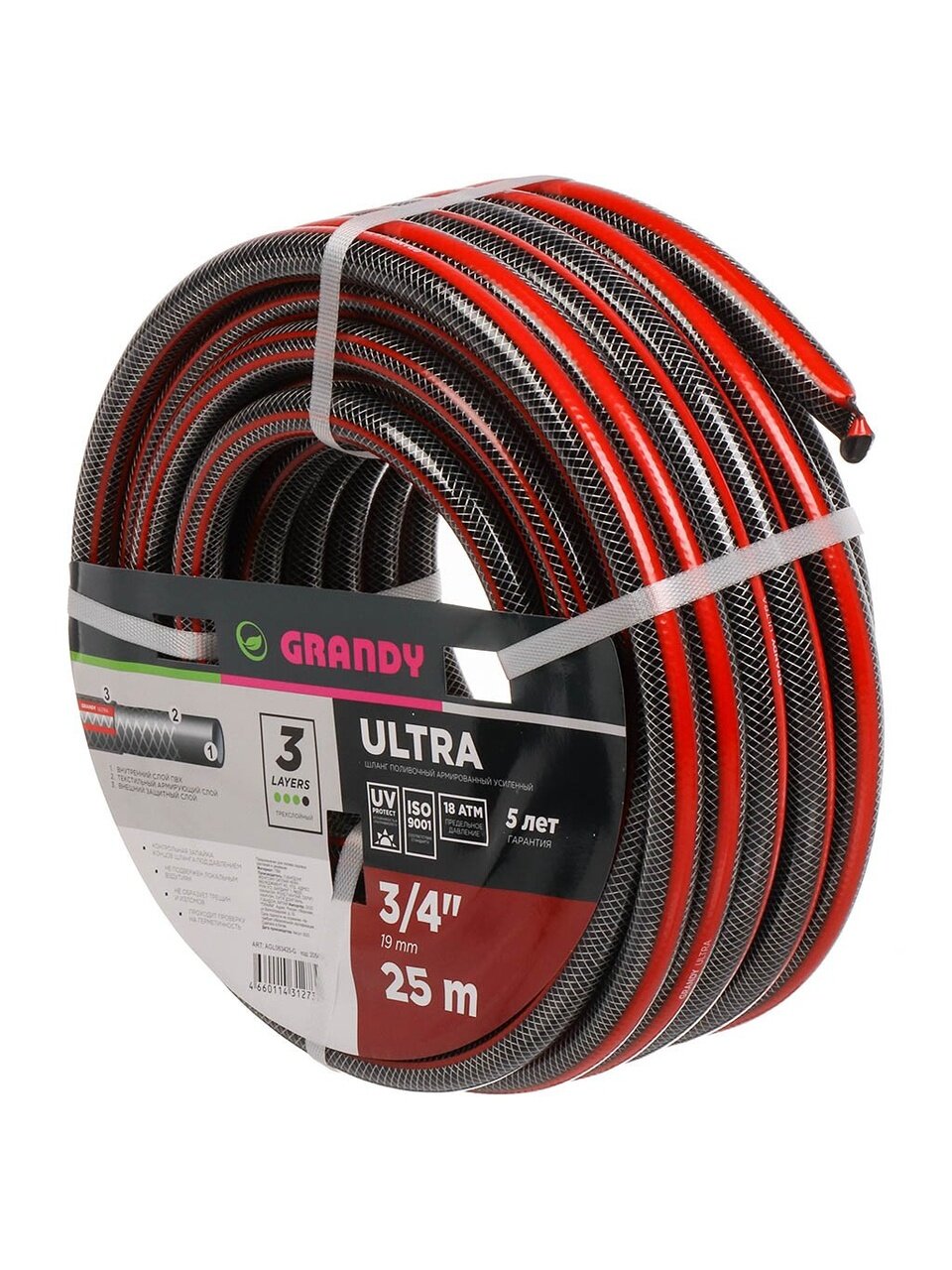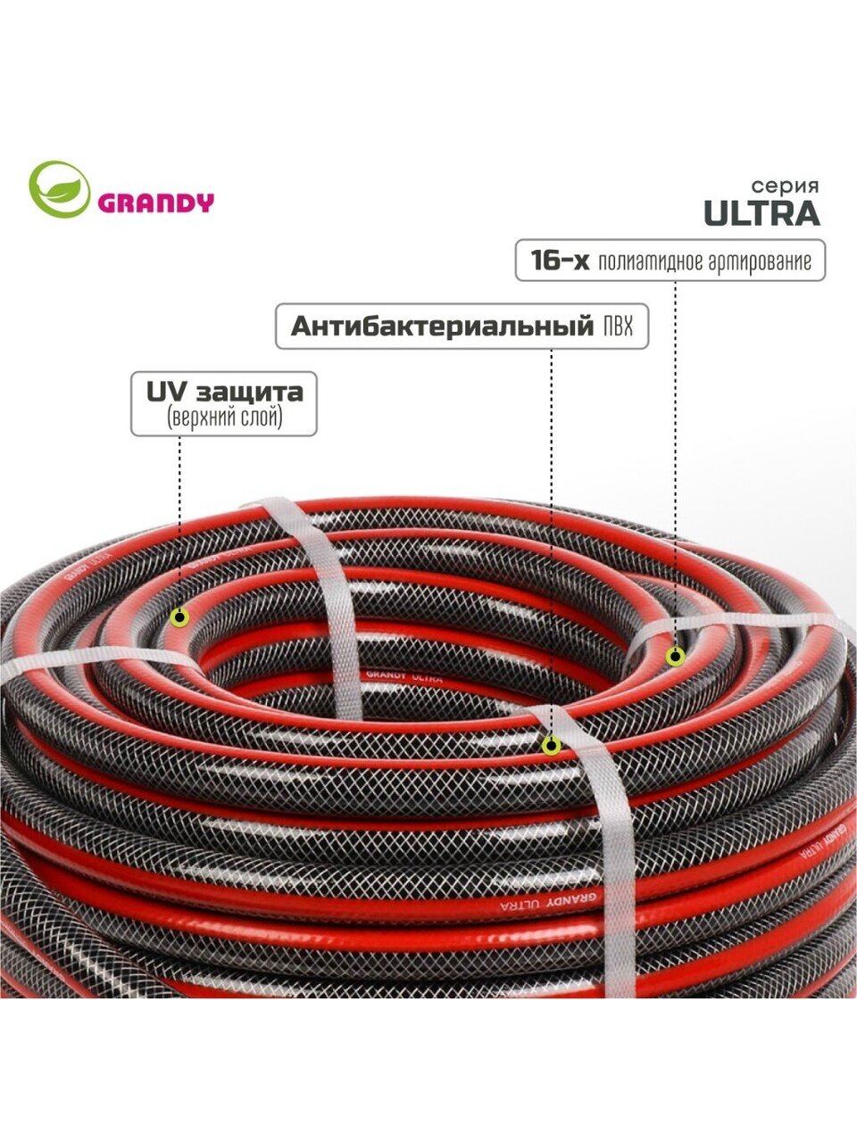 Шланг поливочный армированный Grandy Ultra не подвержен локальным вздутиям, не образует трещин и изломов. Проверен на герметичность, концы шланга запаяны под давлением. Шланг соответствует стандарту ISO 9001. Устойчив к прямым солнечным лучам и ультрафиолетовому излучению. Устойчив к коррозии и истиранию, не токсичен и не содержит солей кадмия. Не образует водорослей и других наслоений на внутренних поверхностях шланга. Три слоя.