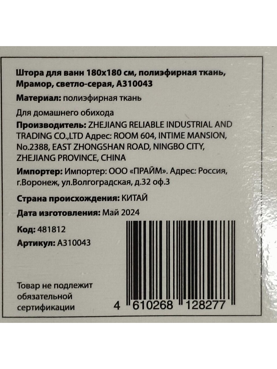 Вы можете приобрести «Штора для ванн 180х180 см, полиэстер, Мрамор, светло-серая, A310043» и другие товары в нашем интернет-магазине в Краснодаре по низким ценам и с бесплатным самовывозом.