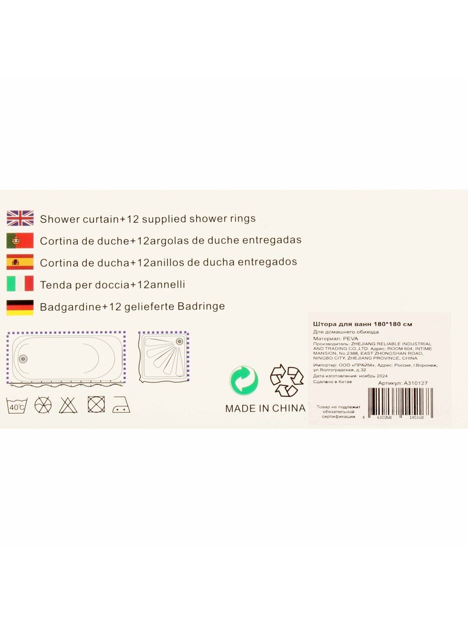 Штора для ванн 180х180 см из материала Peva с рисунком — стильное и практичное решение для оформления ванной комнаты. Белый цвет и современный дизайн освежают интерьер, а влагостойкий материал обеспечивает долгий срок службы и легкость ухода. Универсальный размер подходит для большинства стандартных ванн, сохраняя чистоту и комфорт в помещении.