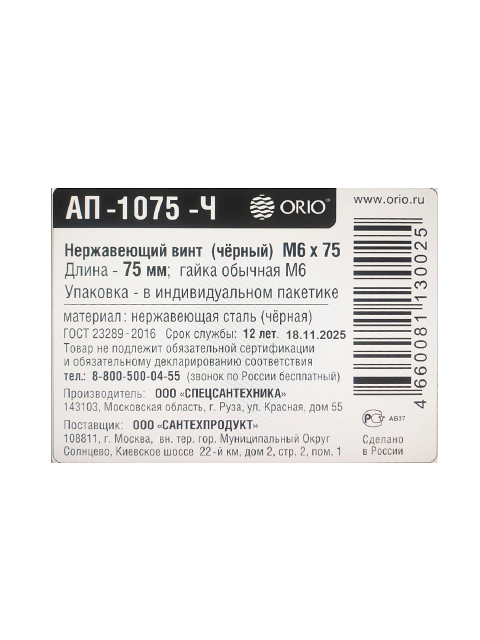 Каковы параметры винта Orio АП-1075-Ч?