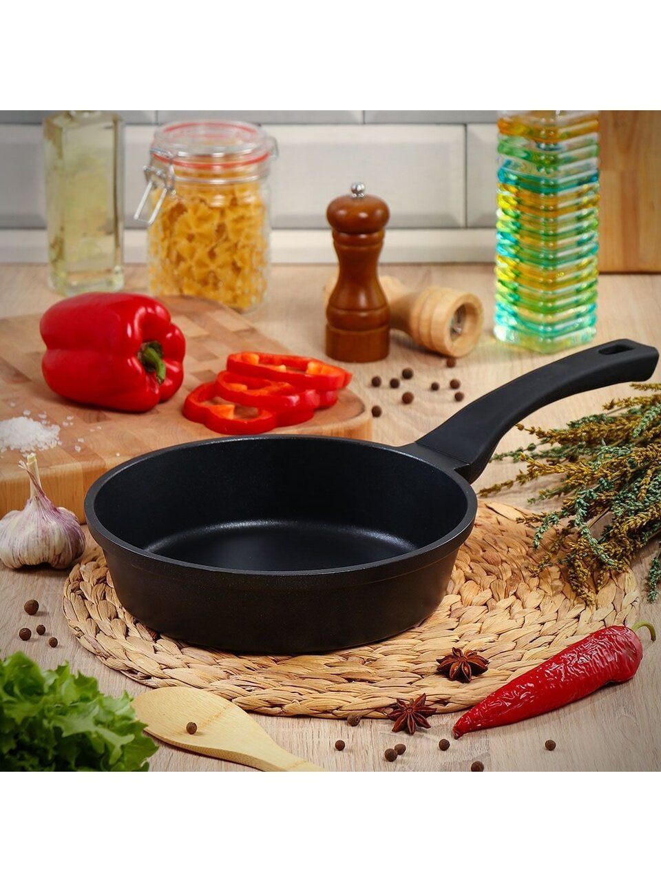 Часто спрашивают: какой сковородой лучше пользоваться для индукционной плиты? Эта модель совместима с индукцией, газом, стеклокерамикой и электричеством — универсальный вариант для любой кухни. Если сравнивать с обычными алюминиевыми сковородами, литой корпус прочнее и служит дольше, а тефлоновый слой надежно защищает от пригорания. Как выбрать размер сковороды? 20 см — оптимально для 1-2 порций, завтраков, быстрых ужинов или использования на даче.