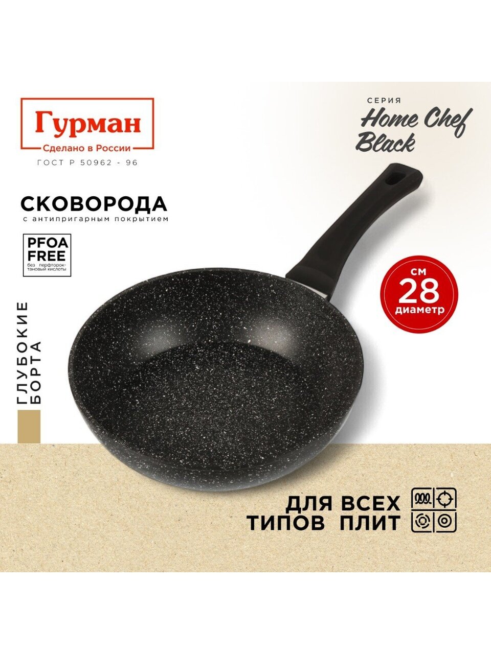 Выбирайте сковороду Гурман HomeChef Black 28 см — заказывайте с гарантией 36 месяцев, быстрой доставкой и возможностью купить недорого универсальную сковороду для дачи, дома или в подарок.