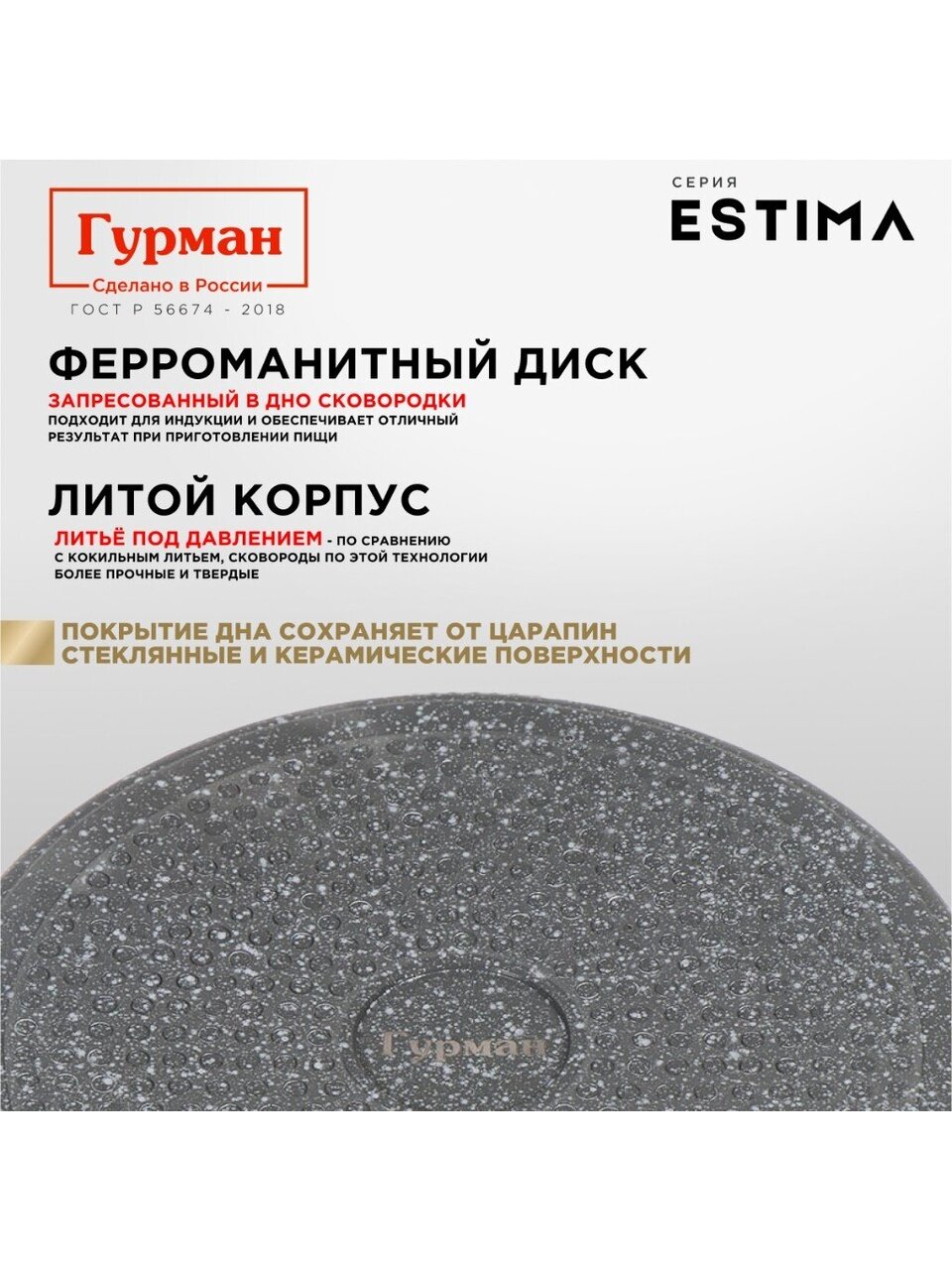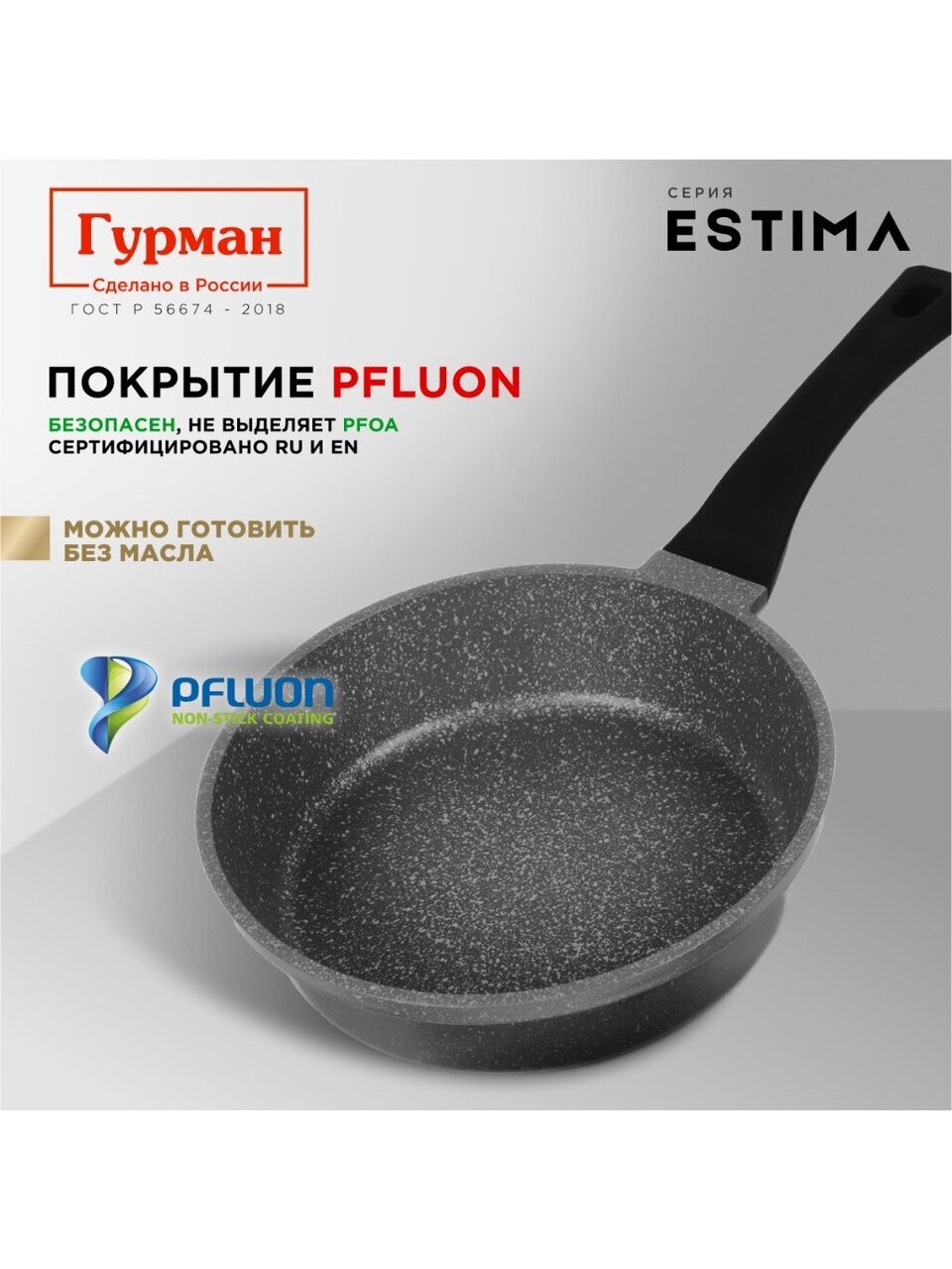 Сковорода из литого алюминия 24 см с гранитным антипригарным покрытием Гурман Estima: жарьте без масла, экономьте время и легко мойте после готовки.