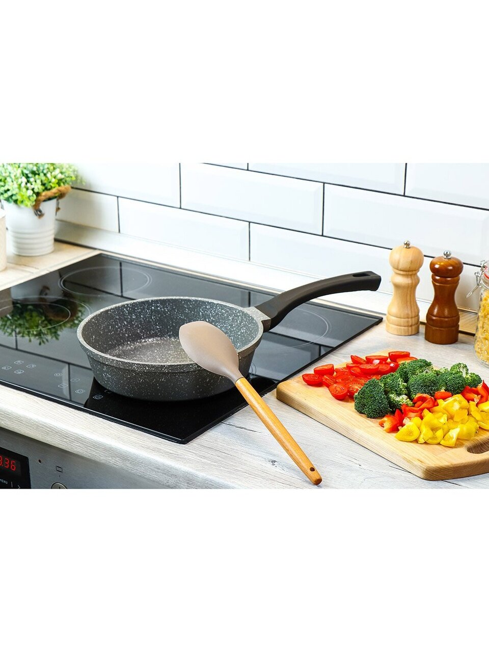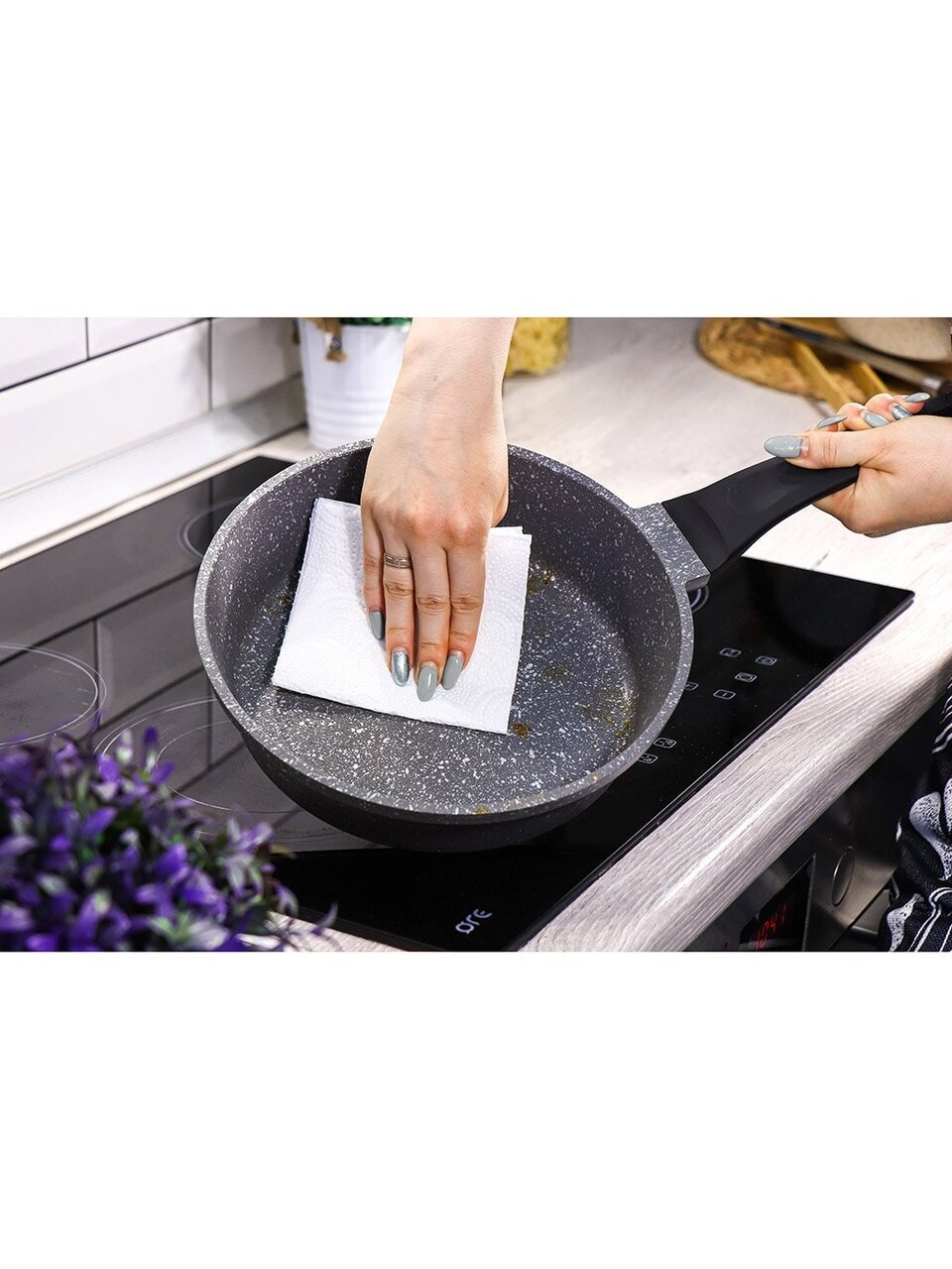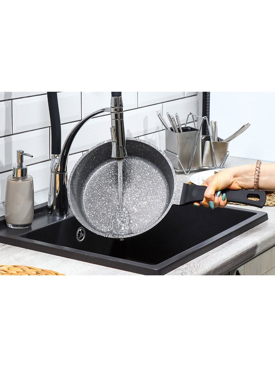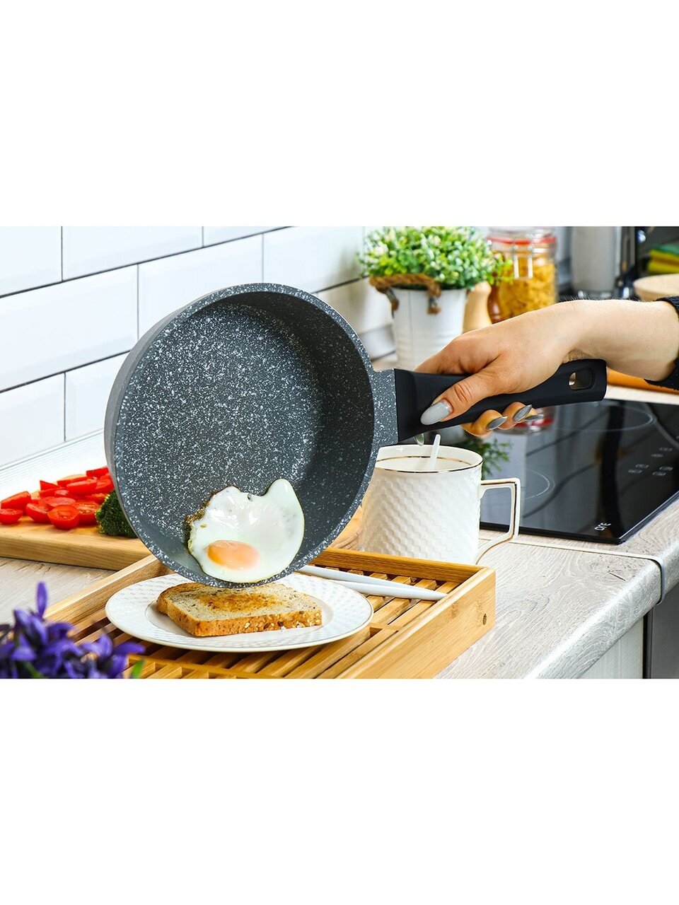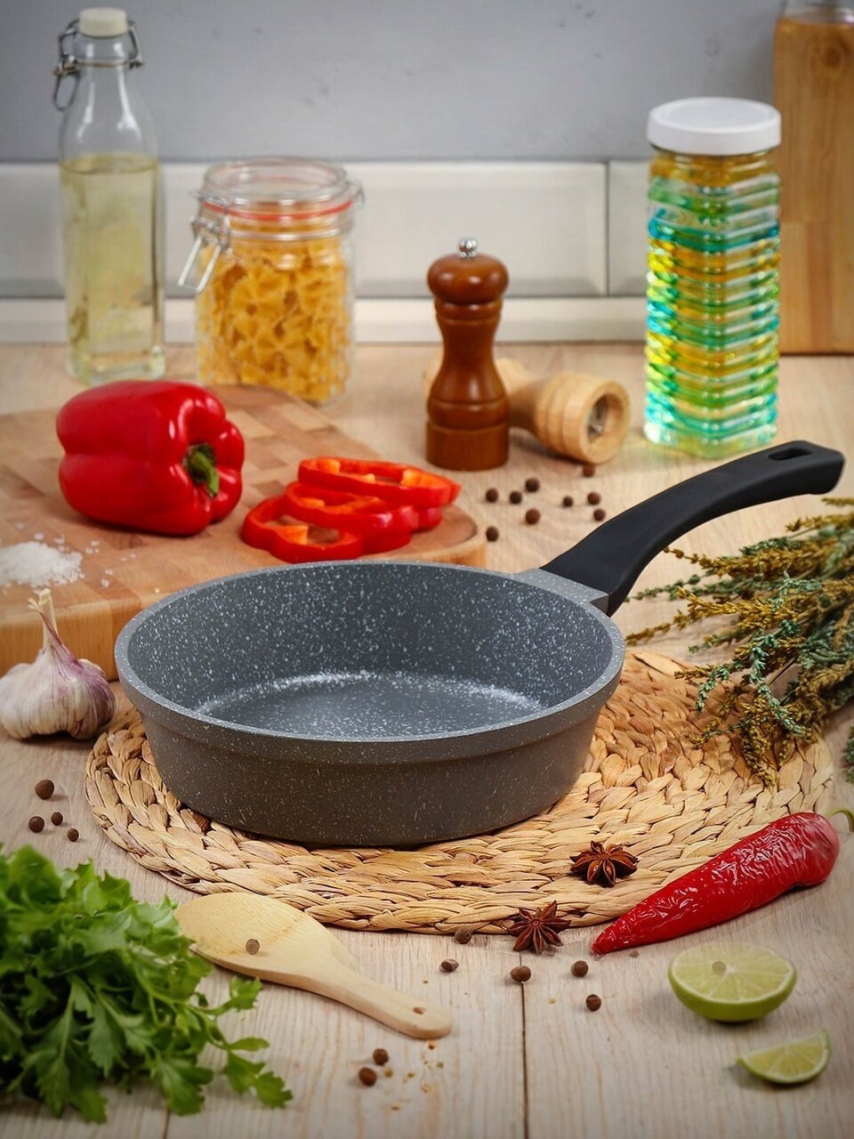 Литой алюминий обеспечивает быстрый и равномерный нагрев, гранитное покрытие устойчиво к царапинам и позволяет готовить с минимальным количеством масла — сковорода служит дольше и легче моется.