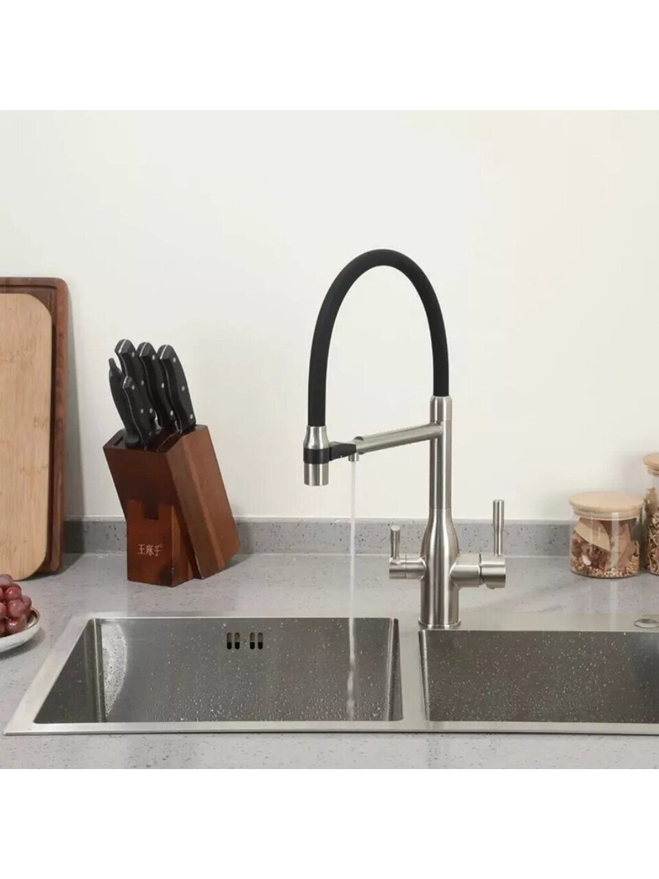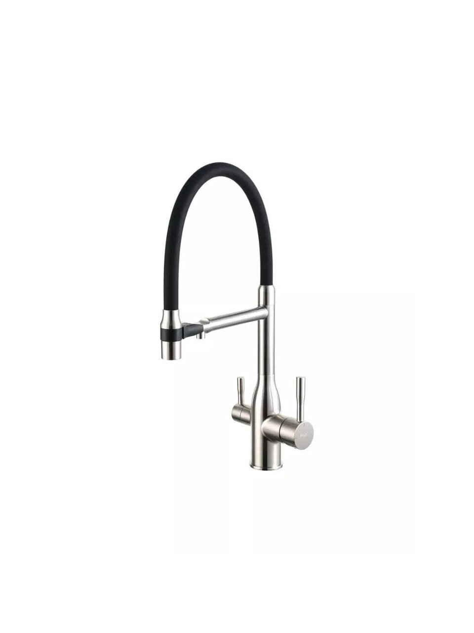 - Излив из латуни 21,3 см высотой и гибкая конструкция — удобно мыть крупную посуду, долговечность до 5 лет