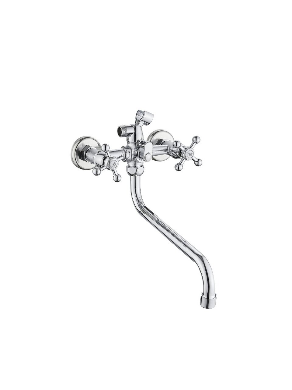 Эта модель подходит для любых условий: прочный цинковый сплав, керамическая кран-букса, длинный поворотный излив 24,5 см, стандартное расстояние между отверстиями 150 мм, монтаж на две точки.