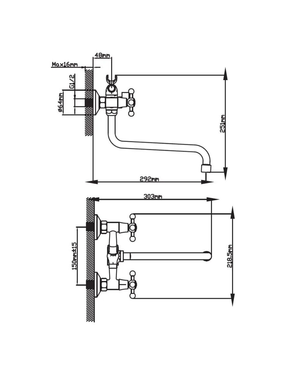 Длина излива — 24,5 см, межосевое расстояние для монтажа — 150 мм, стандарт подводки шланга — 1/2", корпус — цинковый сплав, покрытие — глянцевый хром, крепление — гайка.