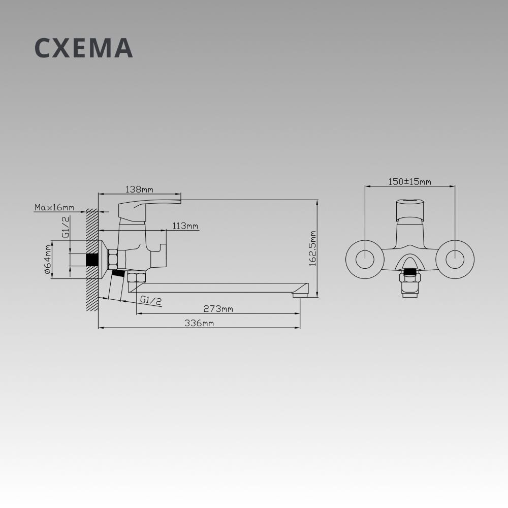 Монтаж вертикальный, настенный, через два отверстия диаметром 12,7 мм, межосевое расстояние — 150 мм. Крепление осуществляется гайкой, стандарт подводки шланга — 1/2".