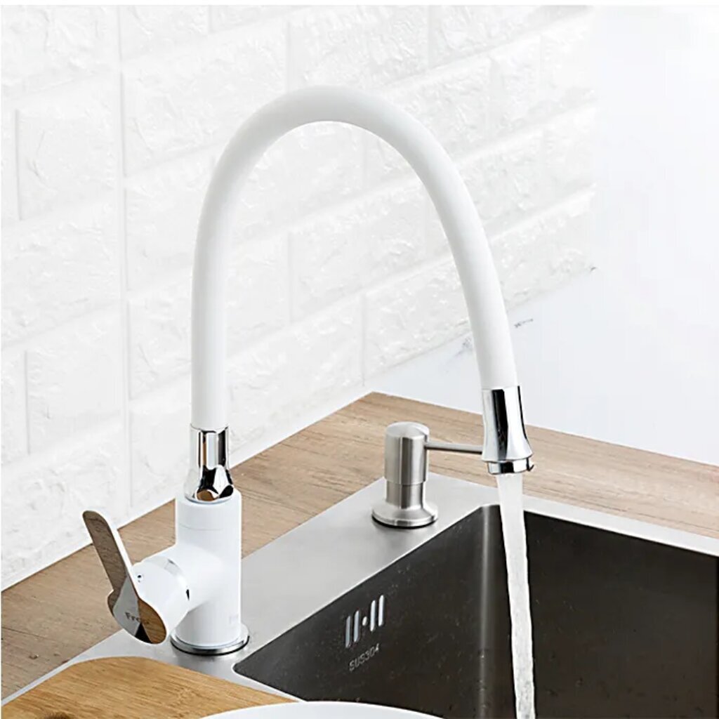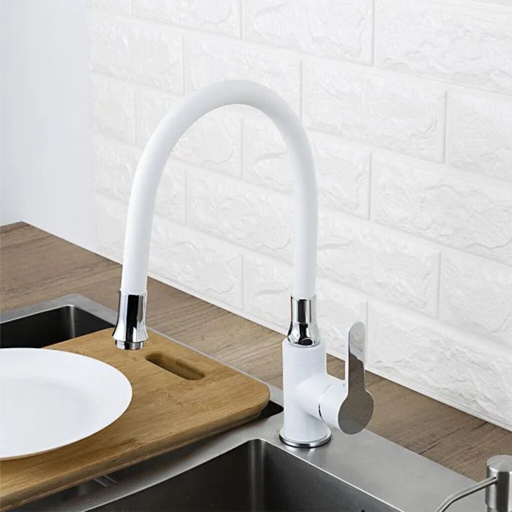 Благодаря среднему размеру излива (54 см) и высокой дуге, этот смеситель подойдет для стандартных и глубоких моек. Белая глянцевая поверхность легко очищается и сохраняет презентабельный вид. В отличие от пластиковых аналогов, латунный корпус устойчив к механическим повреждениям и не тускнеет со временем.