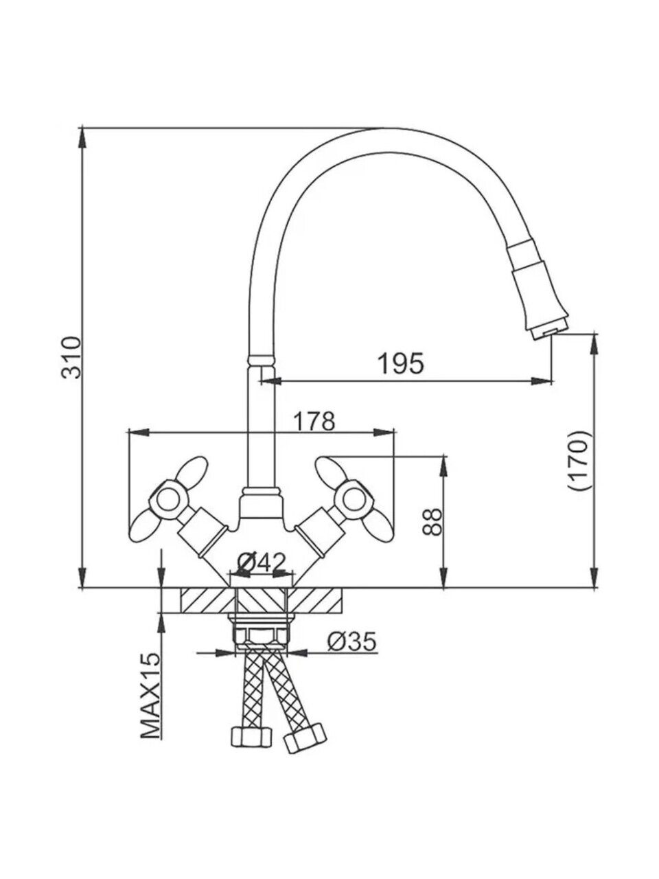Высота излива — 17 см, длина — 19,5 см. Излив гибкий, что позволяет легко менять направление потока воды.