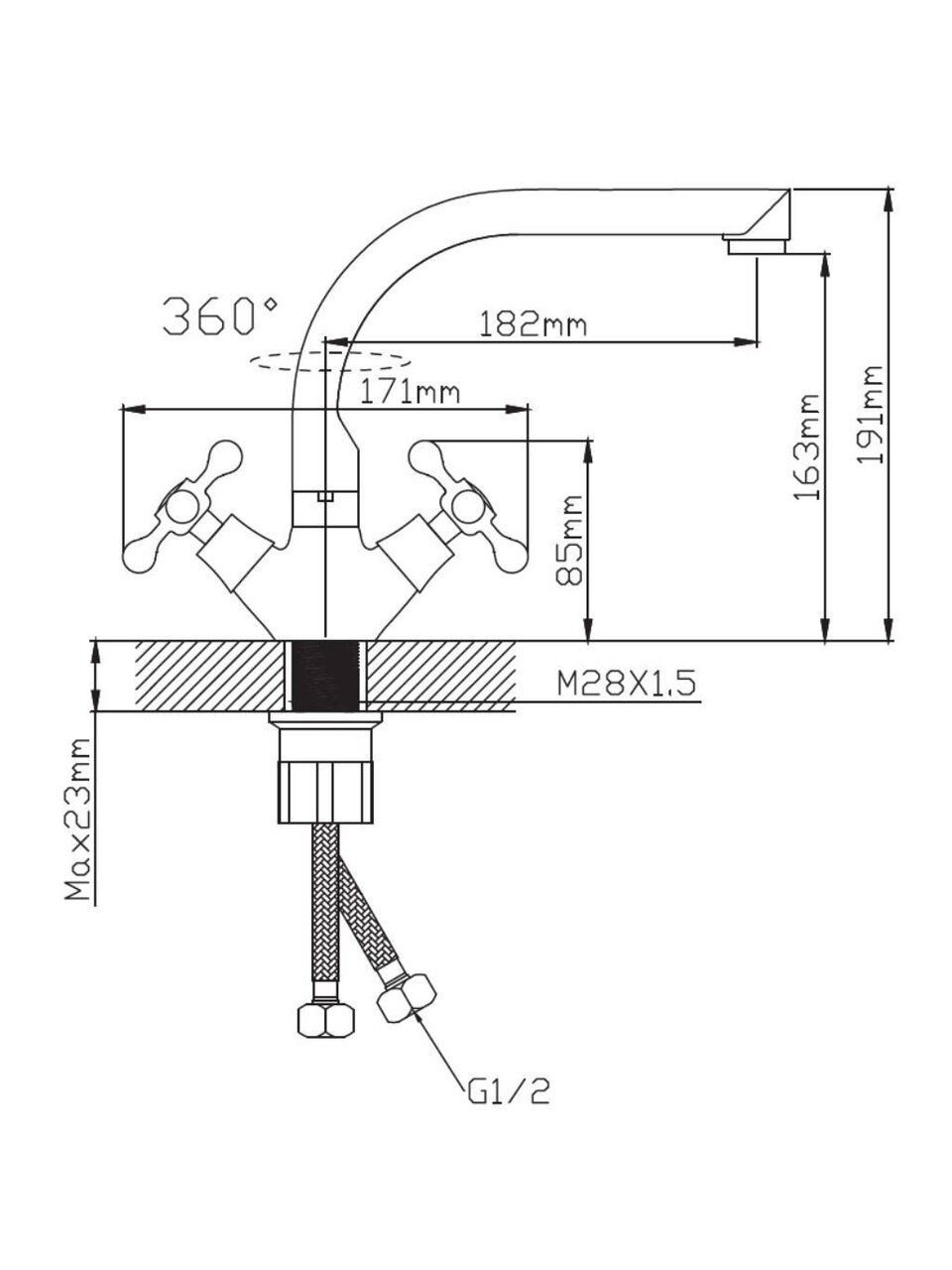 Высота излива — 19,1 см, длина — 18,2 см. Излив поворотный, средний по размеру, подходит для большинства кухонных моек.