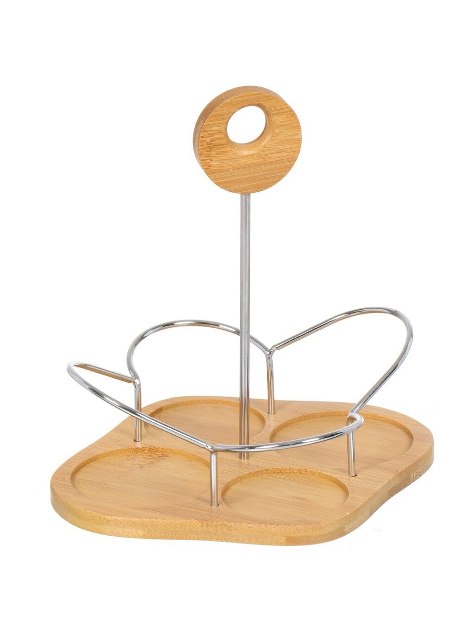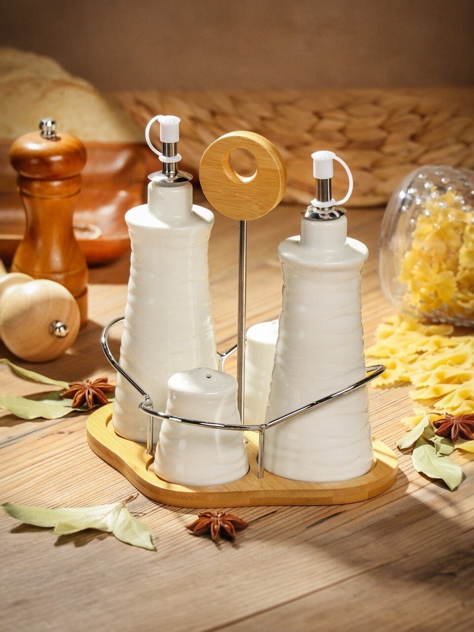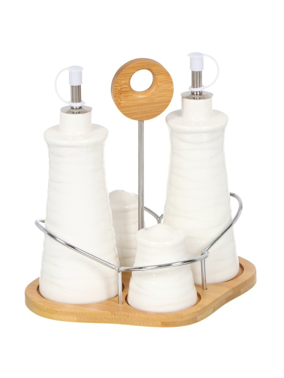 Набор для специй - незаменимый помощник в хозяйстве. Состоит из 2 емкостей для перца и соли (50 мл) и 2 емкостей для масла и уксуса (250 мл). Предметы набора изготовлены из белоснежной керамики и имеют элегантный дизайн. Подставка и крышка сахарницы изготовлены из натурального бамбука. Оригинальный дизайн, эстетичность и функциональность набора позволят ему стать достойным дополнением к кухонному инвентарю и оригинальным подарком.