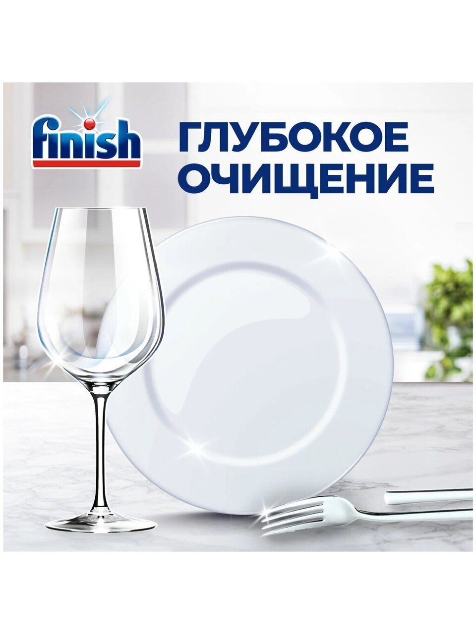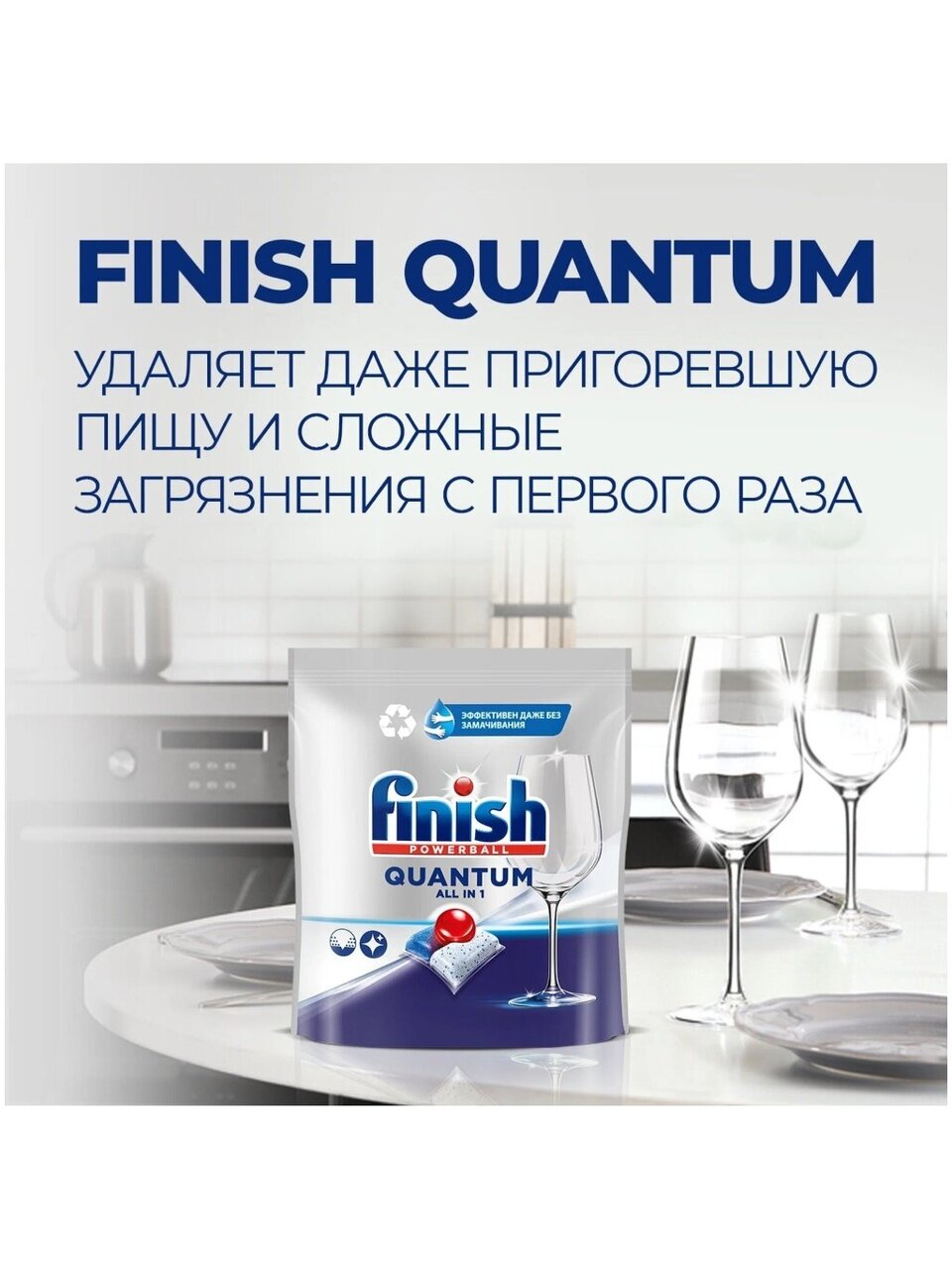 Finish Quantum All in 1 эффективно справляется с различными видами сложных загрязнений даже без предварительного замачивания! Для достижения максимального результата и при очень жесткой воде рекомендуется использовать специальную соль и ополаскиватель Finish.