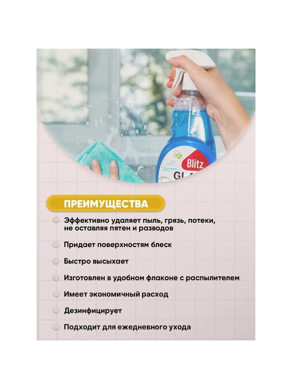 Средство для стекол Blitz с запасным блоком эффективно удаляет пыль, грязь, потеки, не оставляет пятен и разводов. Спрей подходит для мытья зеркал, окон, кафеля, автомобильных окон, панелей бытовых электроприборов, люстр и пластиковых поверхностей.
