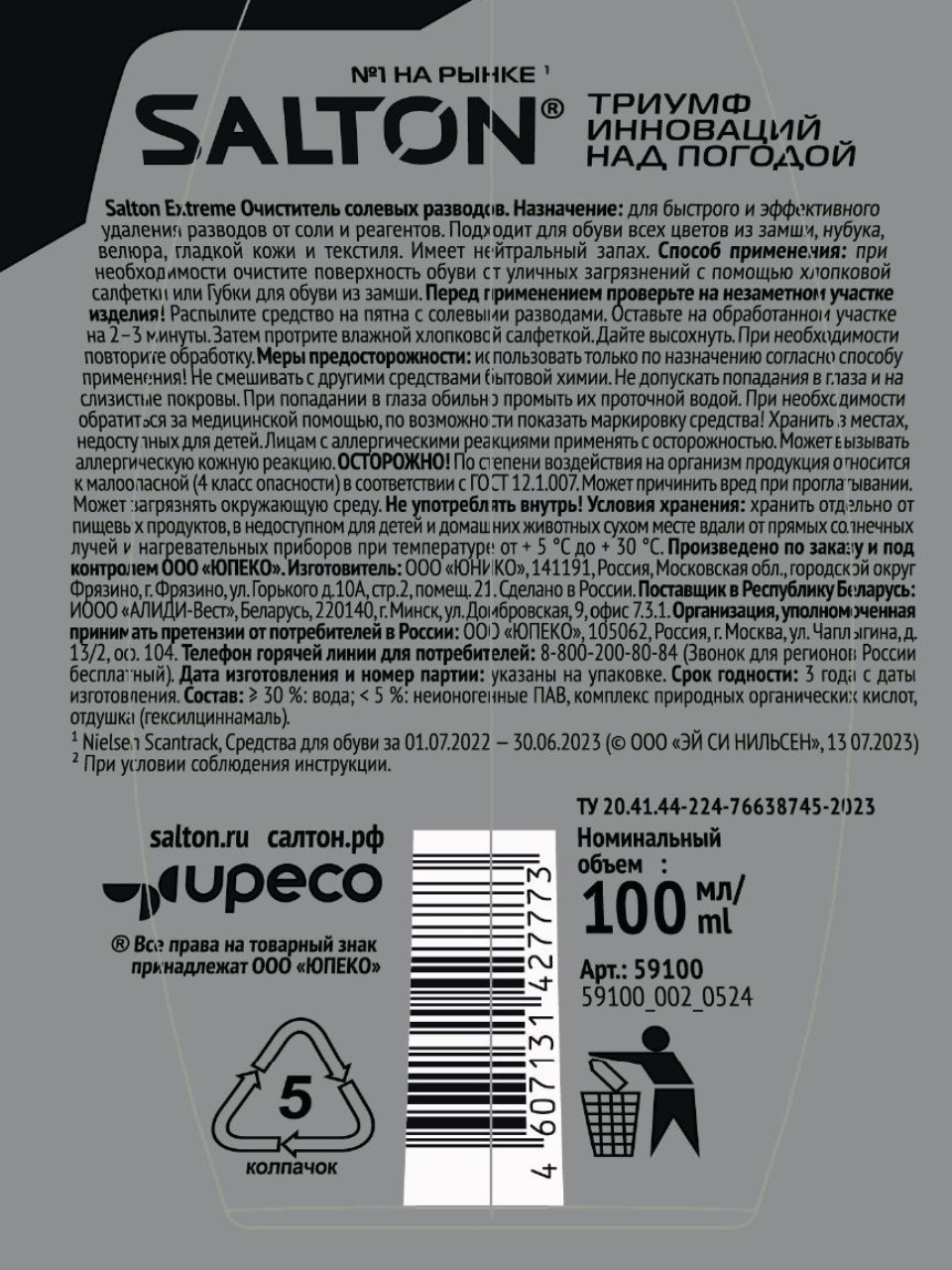 Спрей-очиститель Salton Expert Антисольот 100 мл — быстрое решение для защиты обуви от соли и реагентов зимой. Экспертная формула, удобный формат, результат с первого применения.
