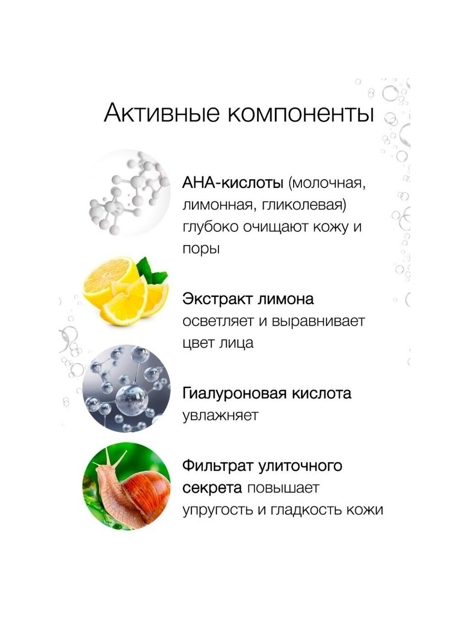Aqua, Cocamidopropyl Betaine, Disodium Laureth Sulfosuccinate, Glycerin, Citrus Limon Fruit Extract (экстракт лимона), Glycolic Acid (кислота гликолевая), Benzyl alcohol, Arctostaphylos Uva Ursi Leaf Extract (экстракт толокнянки), Snail secretion filtrate (фильтрат улиточного секрета), Citric Acid (кислота лимонная), Hyaluronic Acid (кислота гиалуроновая), Lactic Acid (молочная кислота), PEG-40 Hydrogenated Castor Oil, Trideceth-9, Sodium Hydroxide, Parfum, Hydroxyacetophenone, Ethylhexylglycerin.