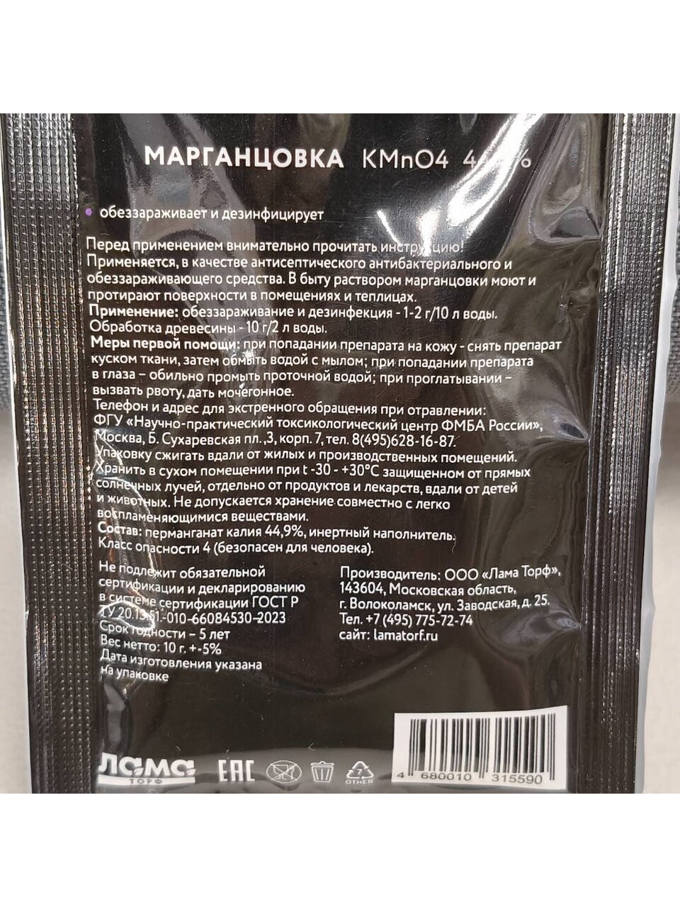 - Состав: перманганат калия 44.9%, инертный наполнитель.