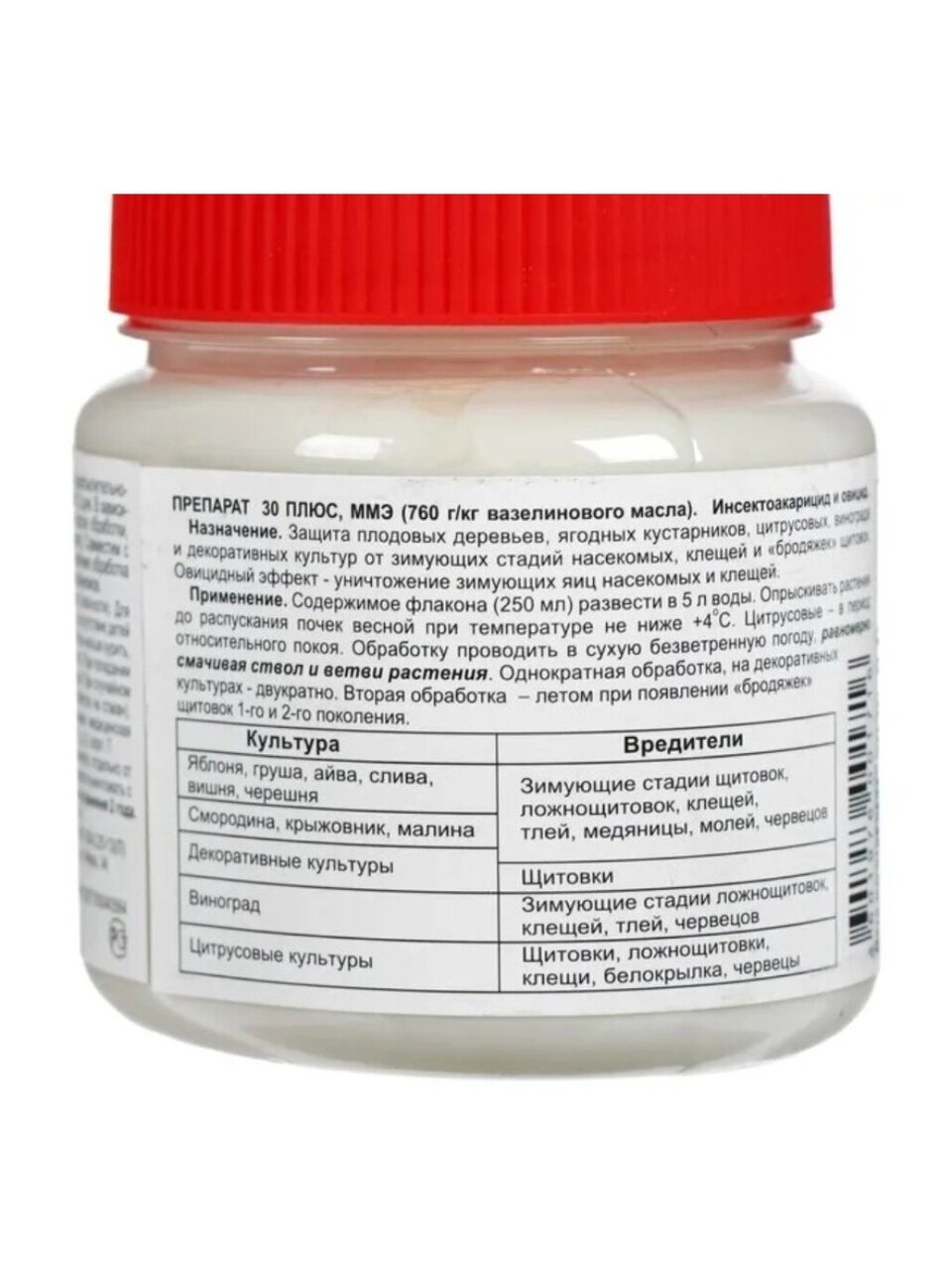 Эмульсия разводится с водой в разных пропорциях для разных видов растений. Препаратом «30 плюс» рекомендуется обрабатывать растения весной до цветения в безветренную погоду при t° не ниже 4°С. Повторную обработку можно провести в летний период, в случае появления вредных насекомых. Нельзя применять препарат во время формирования завязи на плодовых деревьях и кустах.