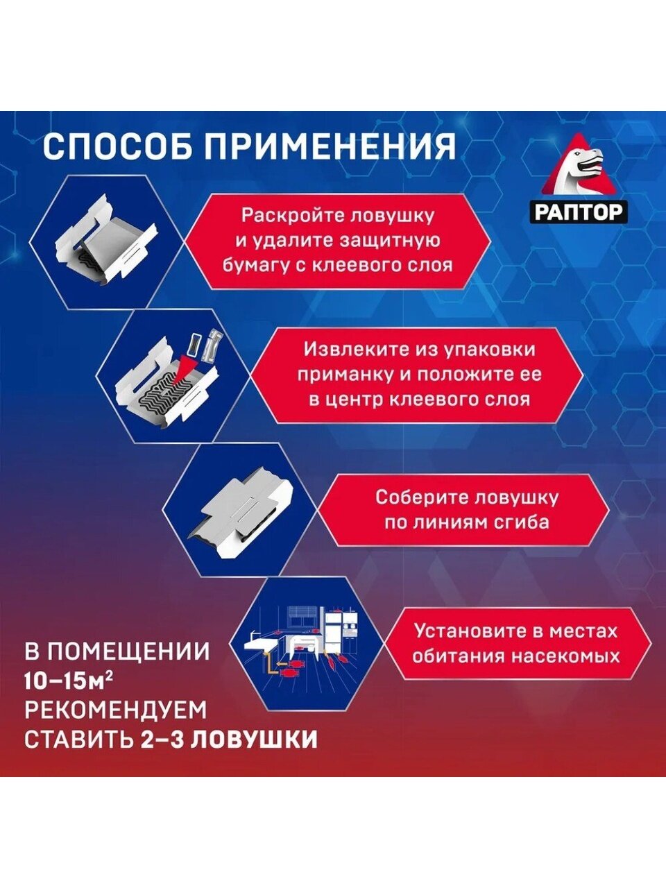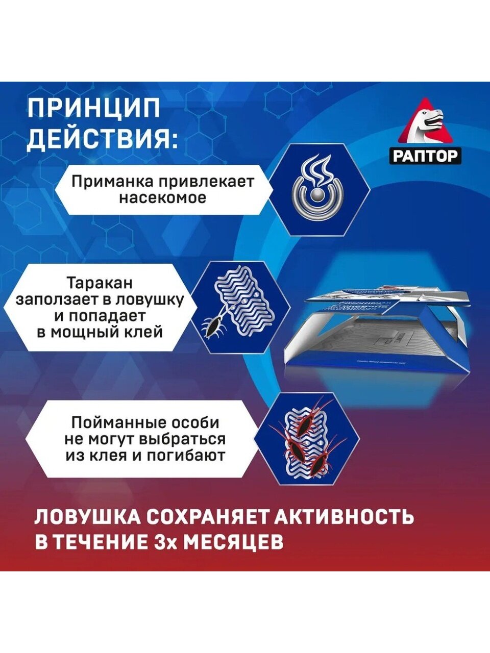 Инсектицид Раптор включает в себя кормушку-приманку с аттрактантом, которая особенно привлекательна для тараканов, а также полимерный клей. Состав не высыхает и сохраняет свои свойства на протяжении 3 месяцев. Тараканы заползают в ловушку, не могут выбраться и погибают.
