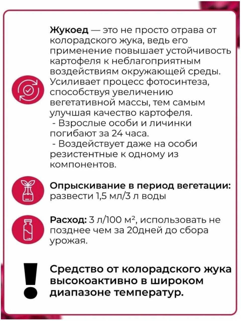 Жукоед обладает высокой скоростью действия и уничтожает даже скрытоживущих вредителей и питающихся на нижней стороне листа. Одна обработка препаратом Жукоед обеспечивает защиту картофеля на весь сезон. Действие препарата Жукоед не зависит от температуры и влажности воздуха. Жукоед — это не просто отрава от колорадского жука, ведь его применение повышает устойчивость картофеля к неблагоприятным воздействиям окружающей среды. Усиливает процесс фотосинтеза, способствуя увеличению вегетативной массы, тем самым улучшая качество картофеля.