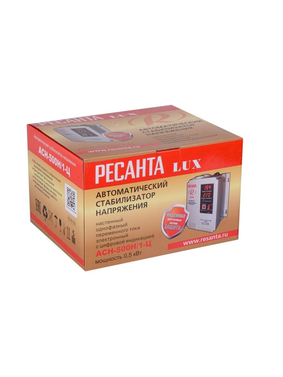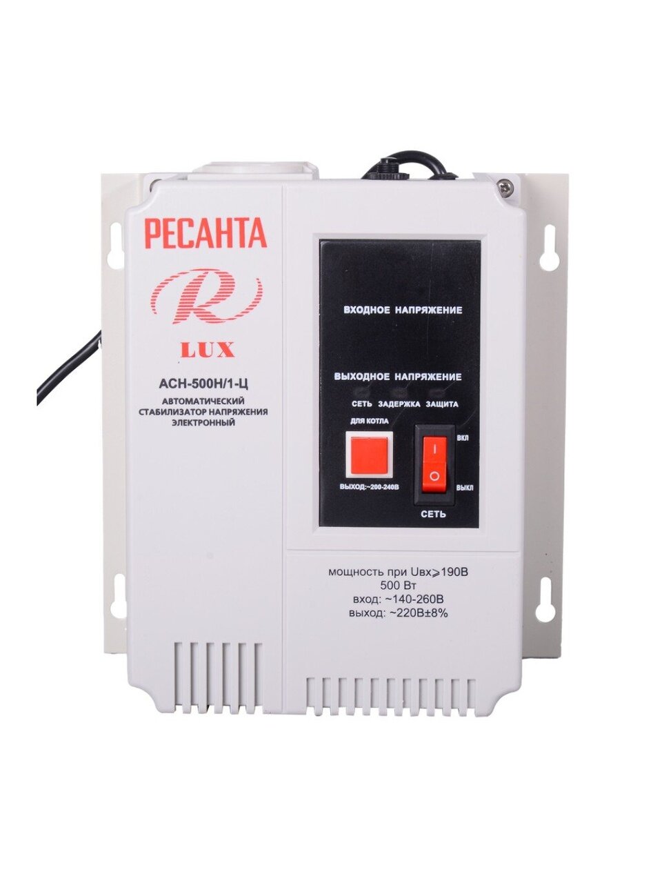 Ресанта Lux АСН-500 Н/1-Ц — это релейный стабилизатор, предназначенный для выравнивания входящего напряжения и защиты электрических устройств от сильных перепадов напряжения мощностью до 0,5 кВт.