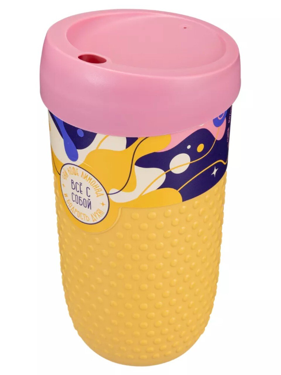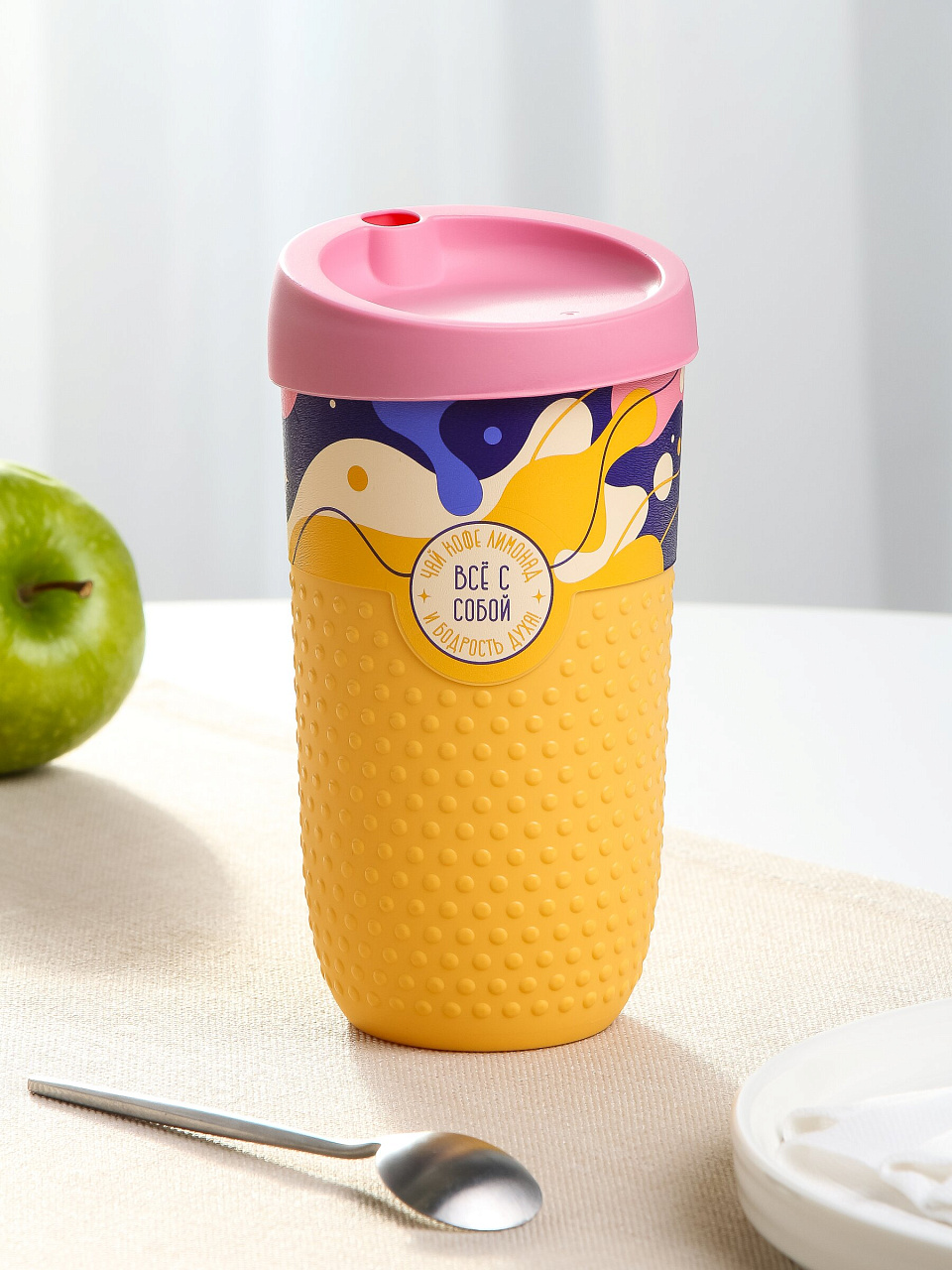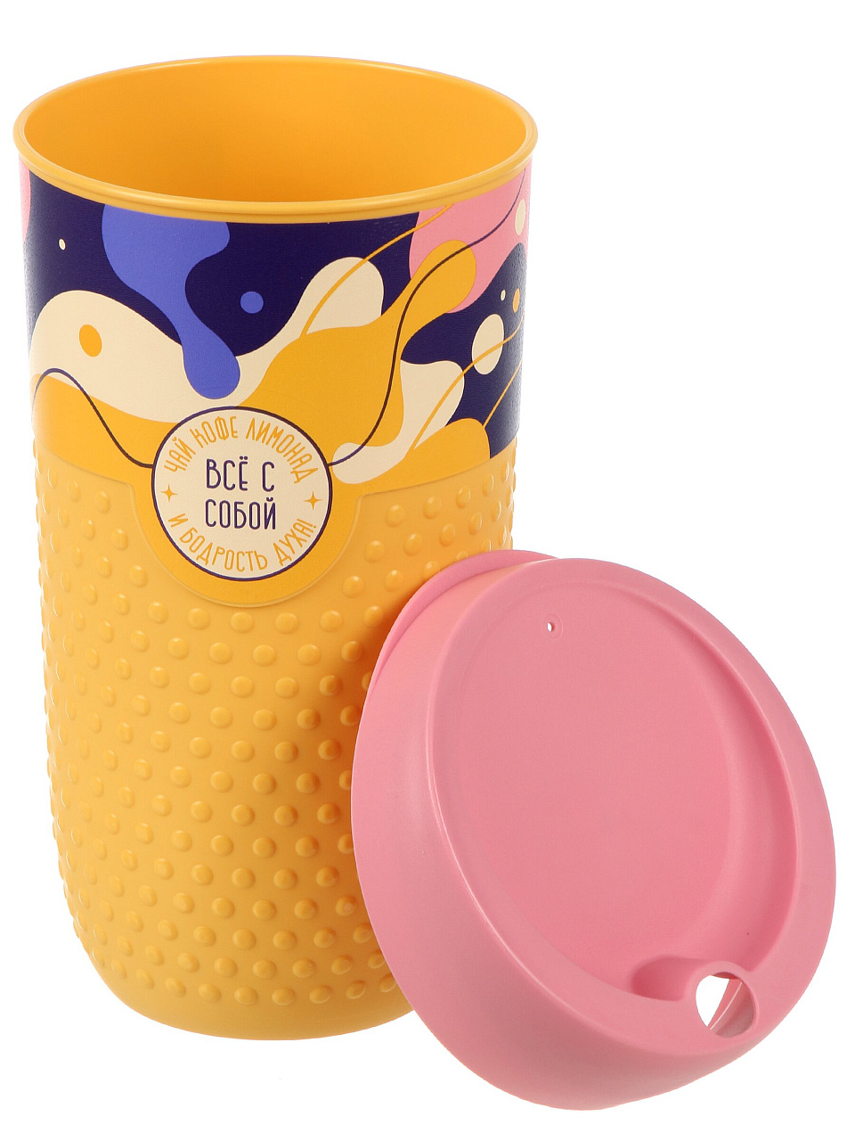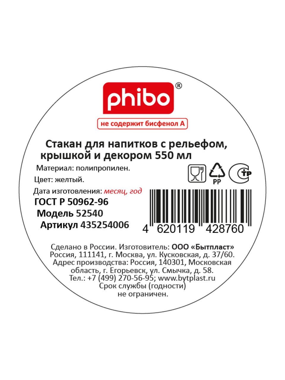 Стакан 550 мл, пластик, Бытпласт, Phibo, с рельефом, с декором, с крышкой, желтый, 435254006