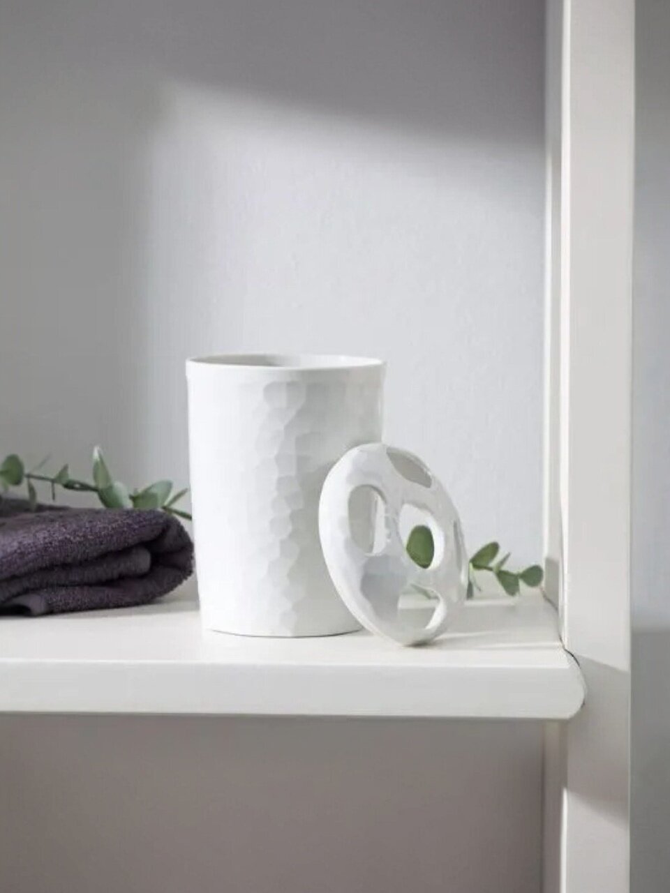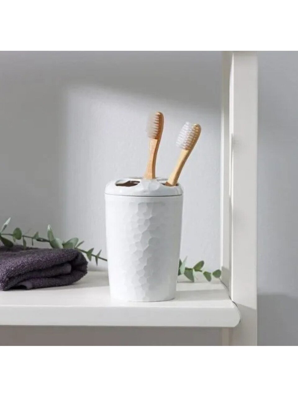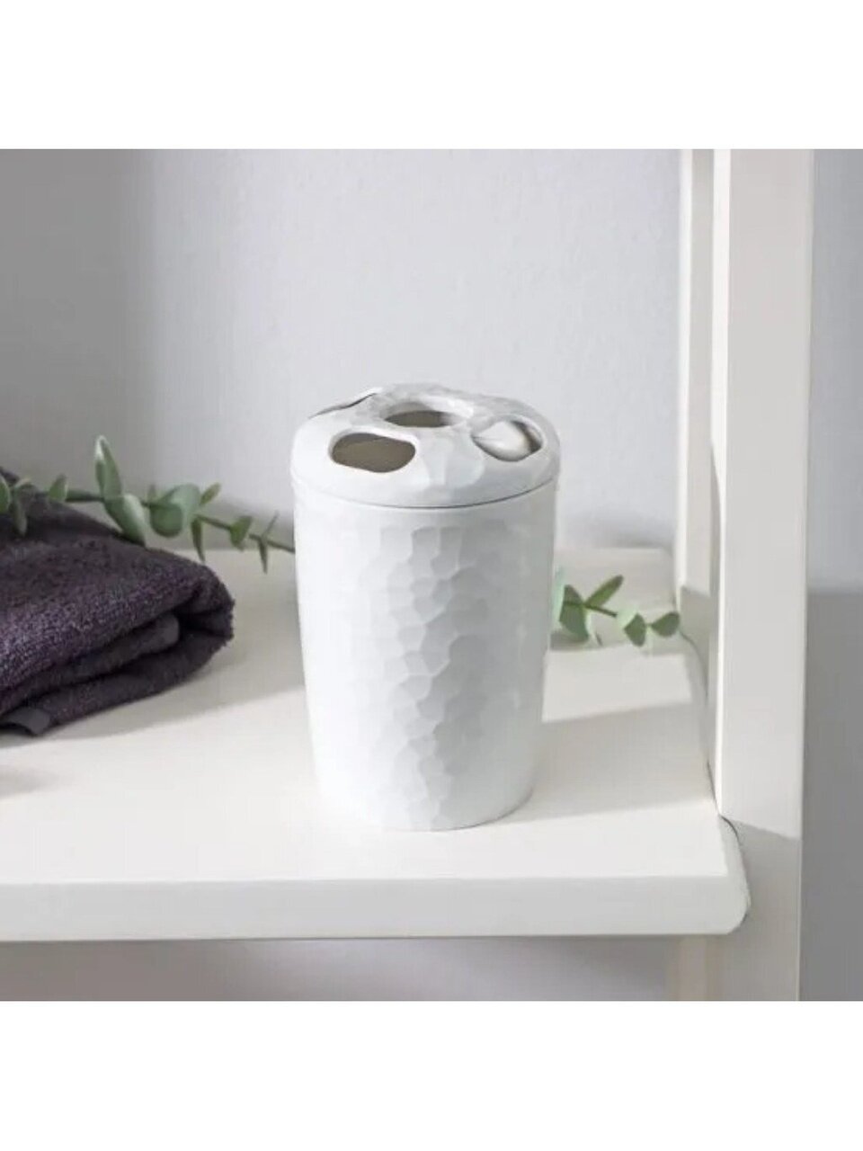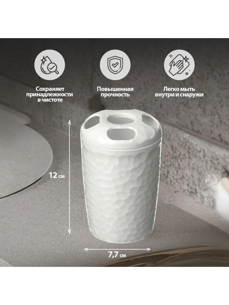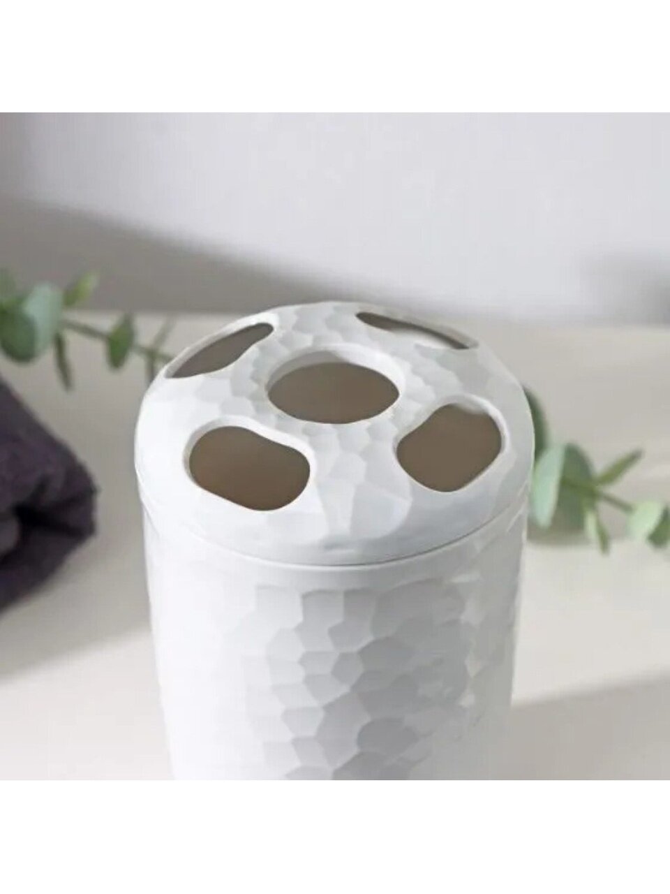 Стакан для зубных щеток Tule отличается устойчивостью, не скользит и не переворачивается. Он изготовлен из качественного фактурного пластика, благодаря чему аксессуар со временем не потеряет свой внешний вид и будет радовать Вас долгое время. Это не просто функциональный аксессуар, но стильный элемент декора Вашей ванной. На крышке предусмотрены четыре отверстия для хранения зубных щеток или бритвенных принадлежностей, что делает использования стакана максимально удобным.