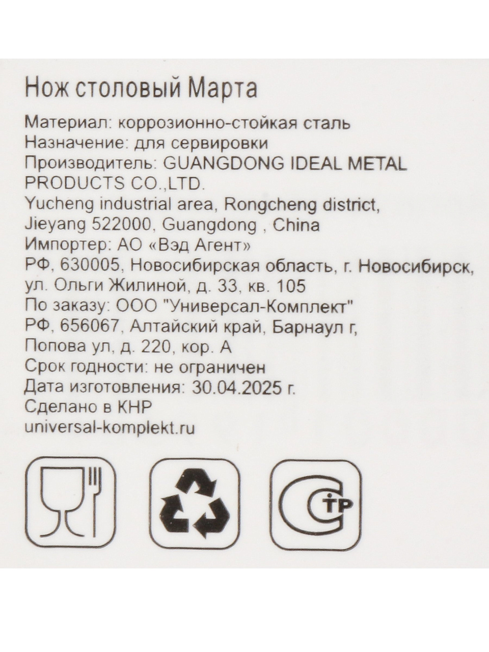Столовый нож из нержавеющей стали Катунь Марта КТ-003-НС-1 — долговечный выбор для дома и дачи: не ржавеет, подходит для посудомоечной машины, оптимален для подарка.