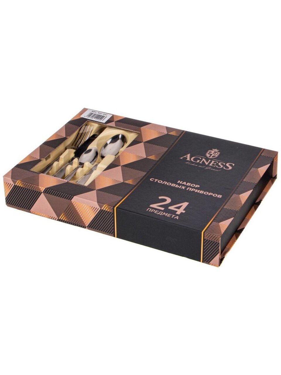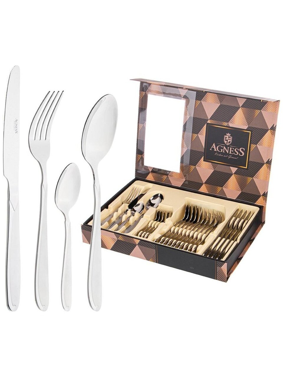 Набор столовых приборов Agness 24 предмета — универсальный подарок и практичный выбор для сервировки стола на 6 персон. Серебристая нержавеющая сталь, стильный дизайн и подарочная упаковка.