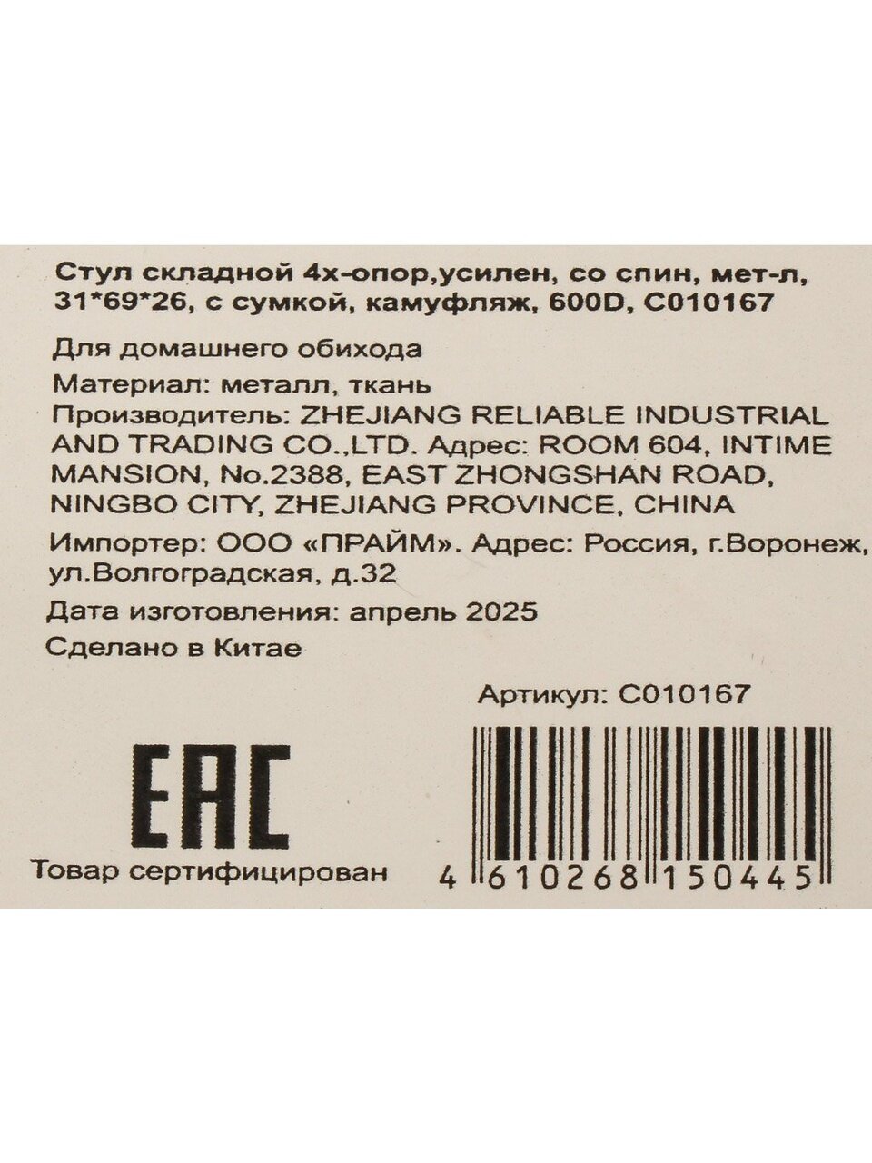 Вы можете приобрести «Стул складной 4х - опорный, усиленный, со спинкой, металл, 31х69х26 см, с сумкой, 600D, камуфляж, C010167» и другие товары в нашем интернет-магазине в Курске по низким ценам и с бесплатным самовывозом.