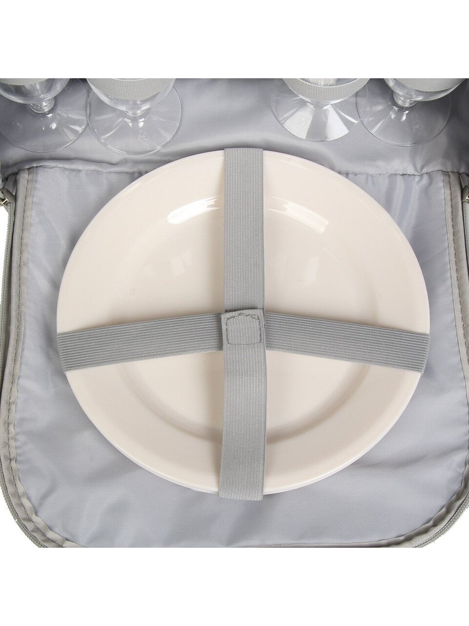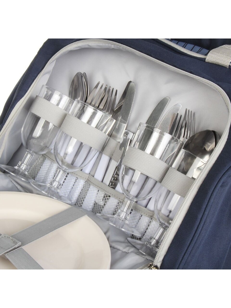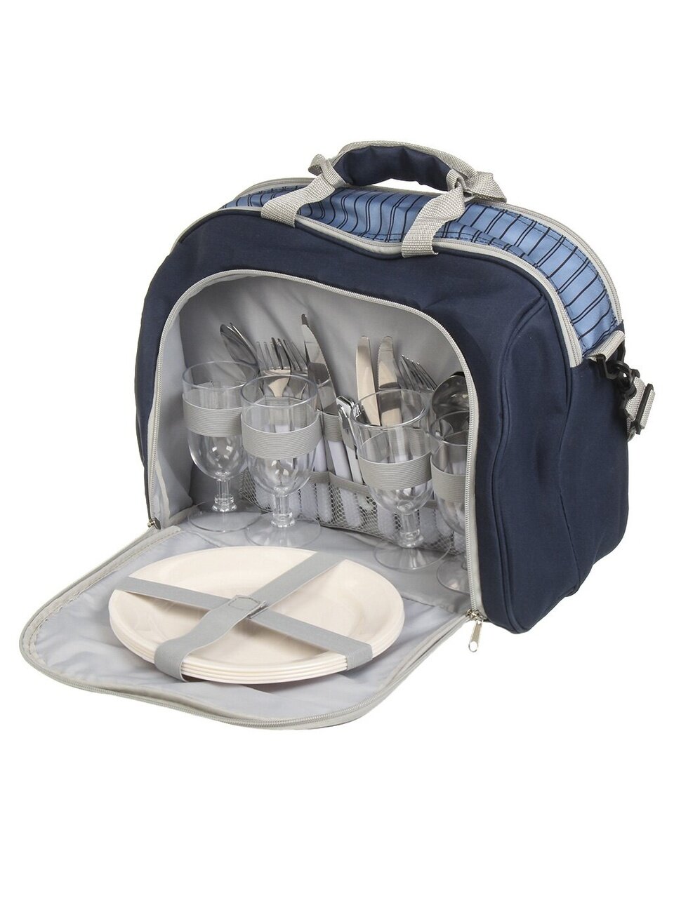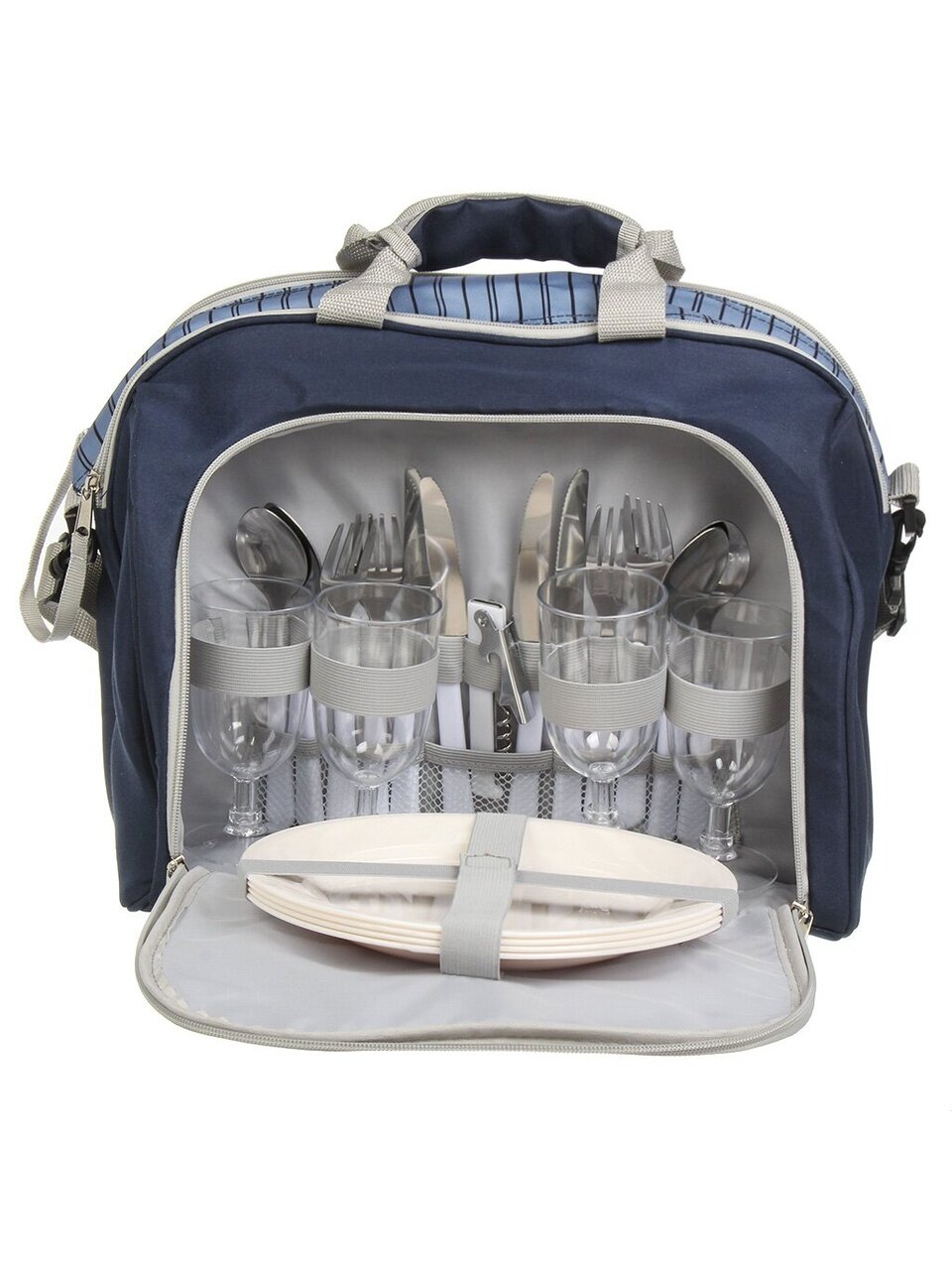 Сумка изготовлена из прочного полиэстера с белой подкладкой PEVA, что обеспечивает надежную защиту от влаги и легкость в уходе. Двойная молния сверху позволяет быстро и удобно получить доступ к отделению для продуктов, не тратя времени на поиски нужного предмета. В комплект также входят аксессуары: ножи, вилки, ложки из нержавеющей стали, бокалы и тарелки из полистирола, а также мультитул, который станет полезным помощником в любой ситуации.