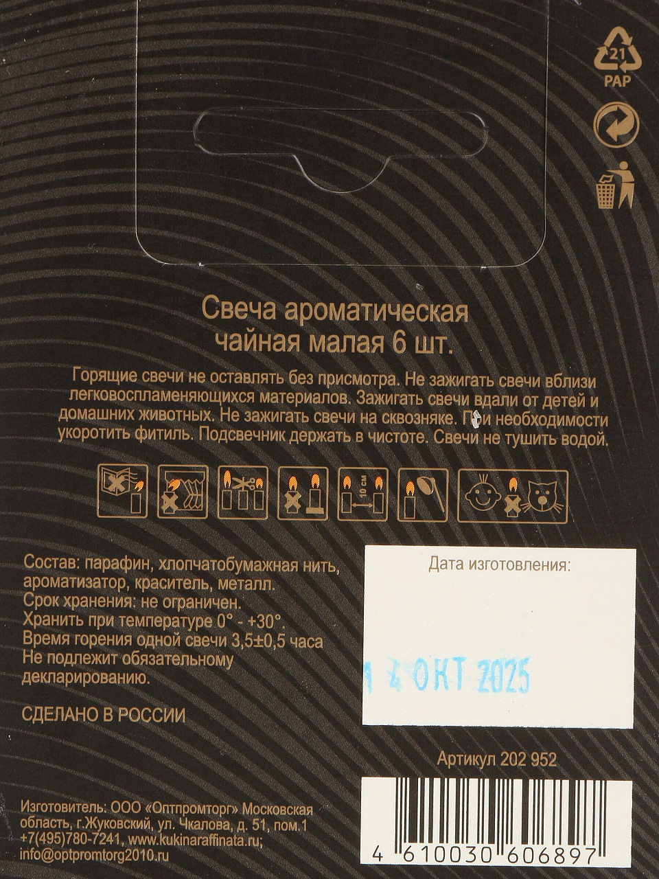 Свеча чайная ароматическая, кругл, 6 шт, Зеленый чай
