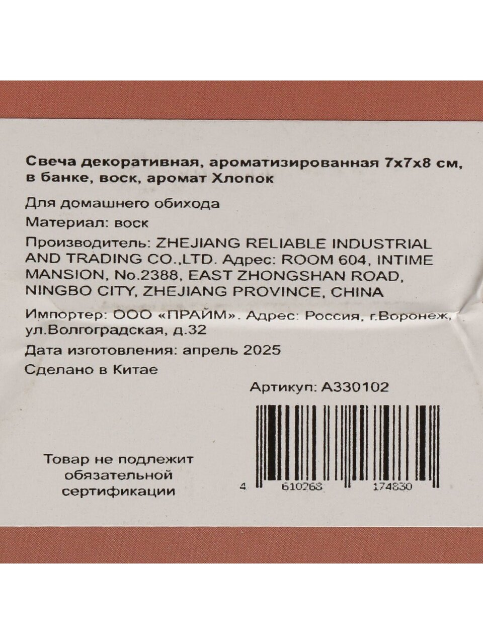 Свеча декоративная ароматизированная 7х7х8 см с ароматом хлопка — стильный акцент для уюта, релакса и подарка. Натуральный соевый воск, хлопковый фитиль, подарочная упаковка.