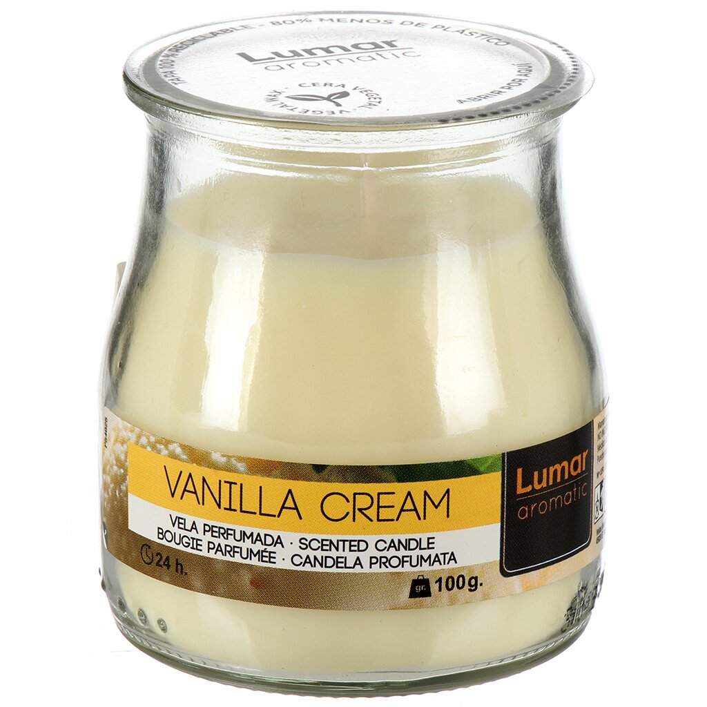 Свеча ароматизированная LUMAR Ванильный крем 100 г — уют и расслабление для дома: натуральный ванильный аромат, стильный стакан, идеальна для подарка и отдыха.