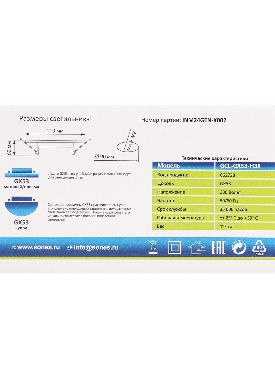 Светильник рассчитан на лампы с цоколем GX53, работает от сети 230 В, степень защиты IP20 — для сухих помещений.