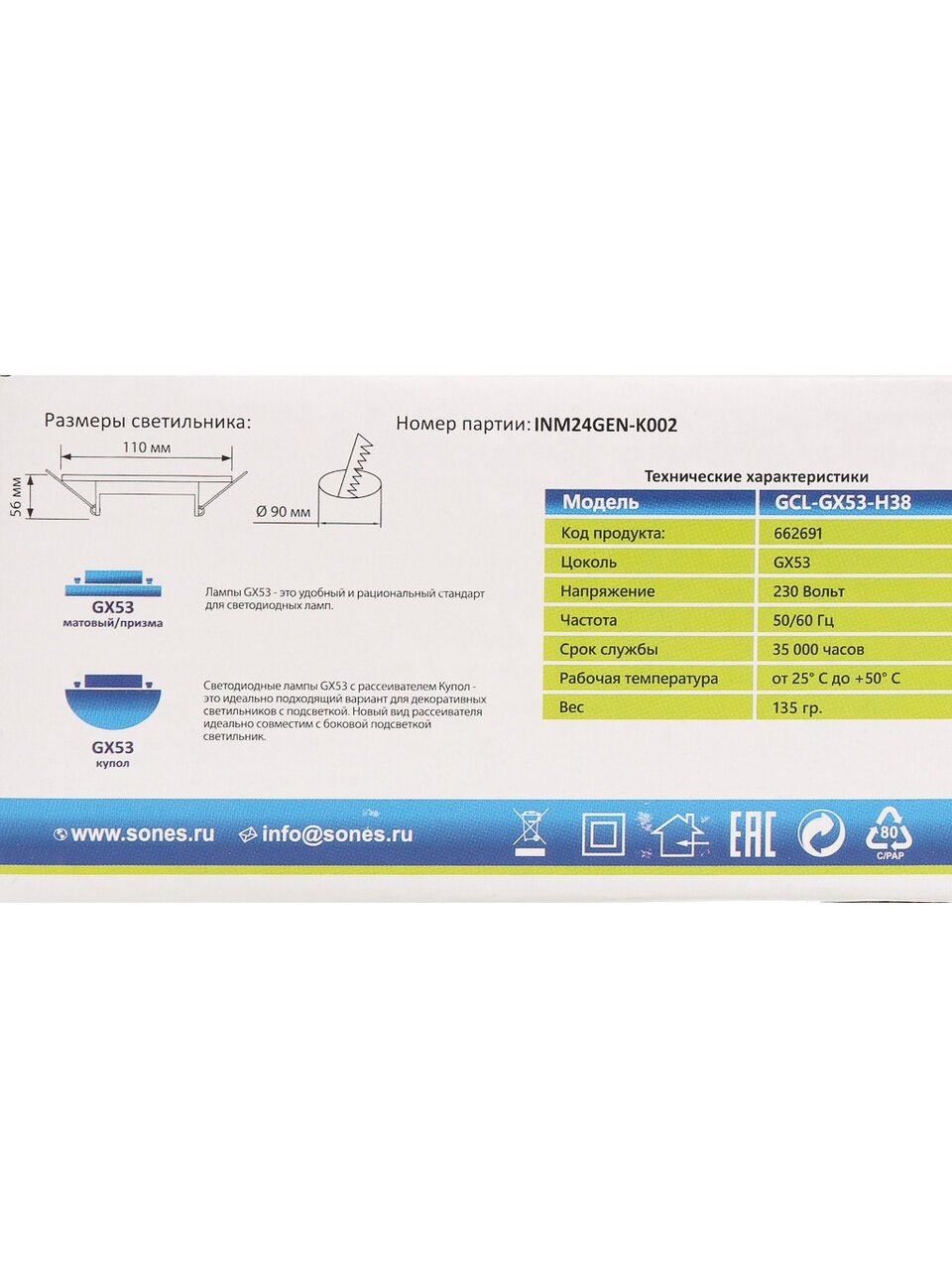 - Компактные размеры (высота 5,6 см, отверстие 90 мм), цоколь GX53, 24 месяца гарантии