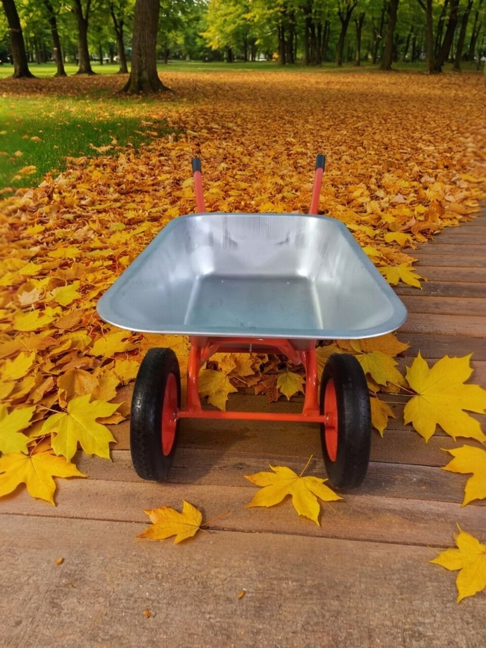 Двухколесная конструкция с пневматическими колесами обеспечивает отличную маневренность и устойчивость, что особенно важно при работе на неровных поверхностях. Тачка легко перемещается даже по сложным участкам, снижая физическую нагрузку на пользователя. Это позволяет сосредоточиться на выполнении задачи, не отвлекаясь на трудности с транспортировкой материалов.