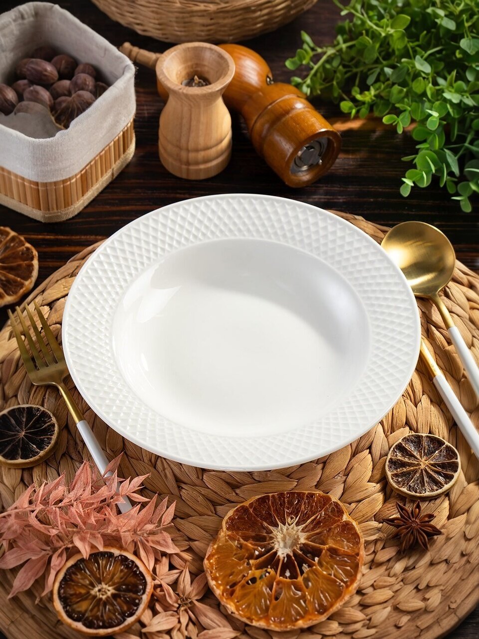 Суповая тарелка Daniks Гринвич диаметром 22 см изготовлена из прочной керамики, что обеспечивает долговечность и устойчивость к сколам. Белый цвет и минималистичная форма делают её универсальным выбором для сервировки как первых блюд, так и пасты, салатов или каши. Если вы ищете, какую тарелку выбрать для ежедневного использования или праздничного ужина, этот вариант подойдёт для любой кухни и стиля.