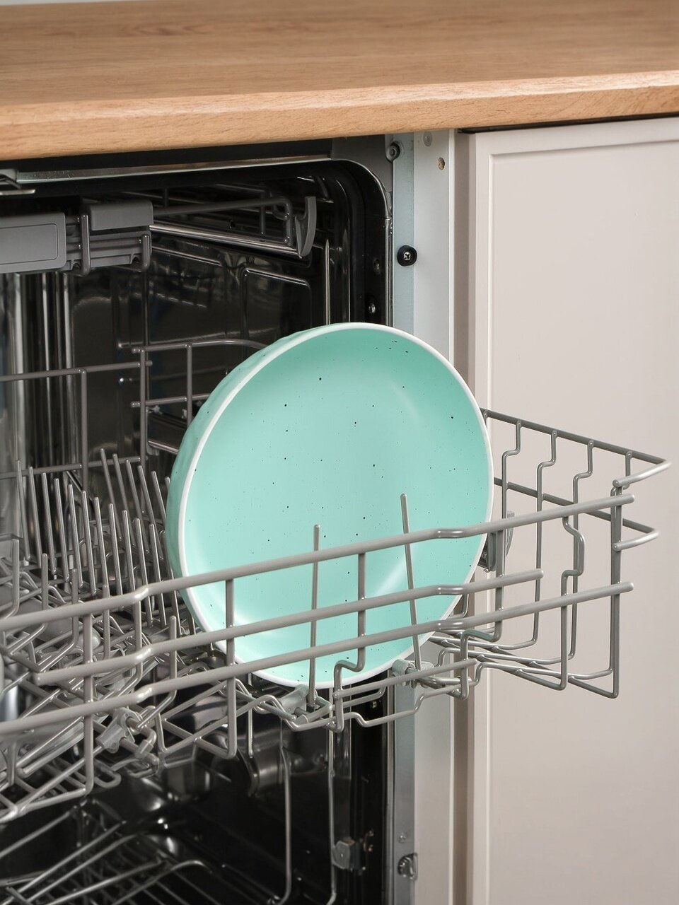 Главные отличия — прочная керамика, оригинальный бирюзовый цвет с крапинкой, универсальный размер 20 см, возможность мытья в посудомоечной машине и использования в микроволновке.