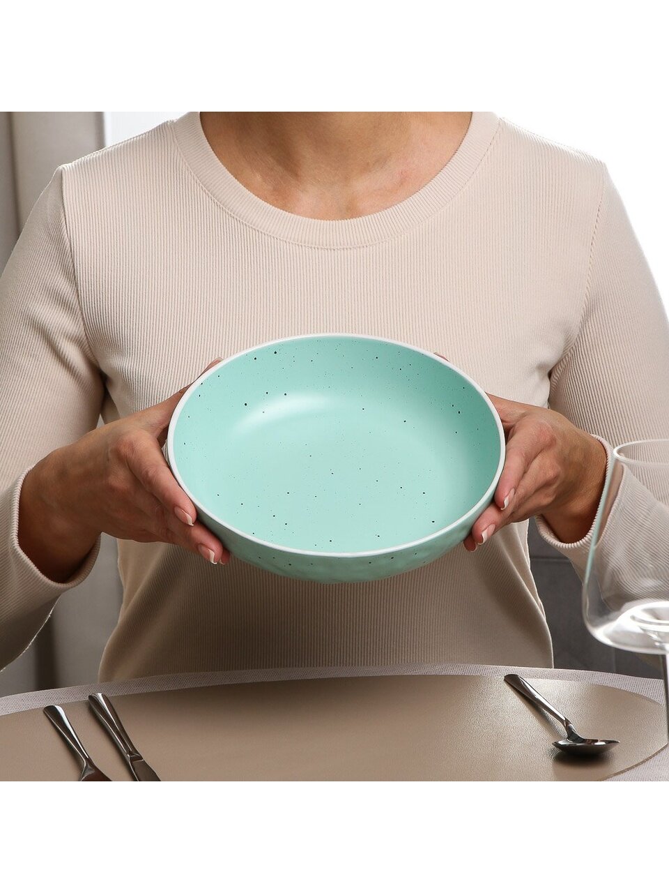 - Эффектный дизайн — бирюзовая суповая тарелка с крапинкой из коллекции Domenik Colors подчеркнёт современный интерьер