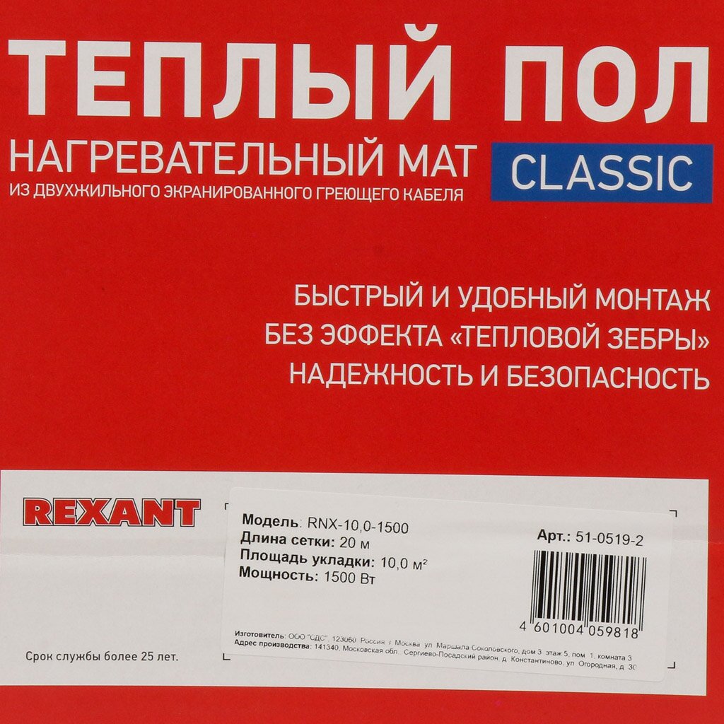 Вы можете приобрести «Теплый пол 10 м2, 1500 Вт, 0.5х20 м, нагревательный мат двухжильный, с экраном, Classic RNX-10-1500, Rexant» и другие товары в нашем интернет-магазине в Иваново по низким ценам и с бесплатным самовывозом.
