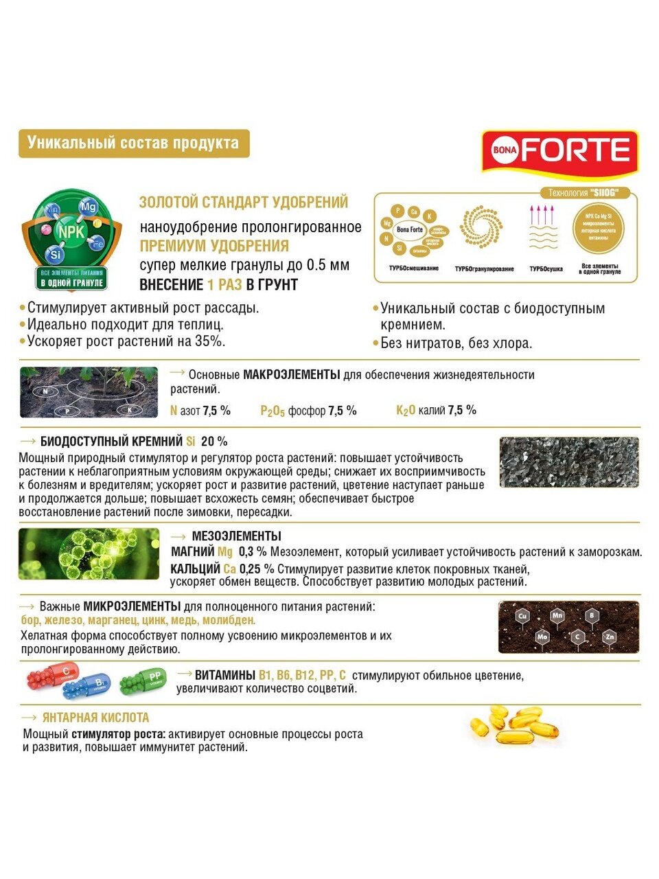 Состав: N:P:K + Si + Mg + Са + TE + V+SA - азот (7,5), фосфор (7,5), калий (7,5) + биодоступный кремний (20) + магний (0,3), + кальций (0,25) + микроэлементы + витамины+янтарная кислота.
