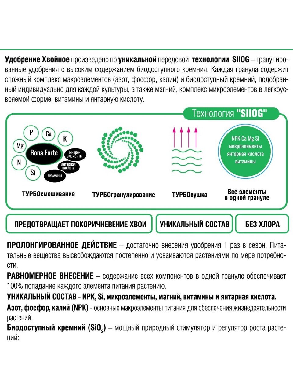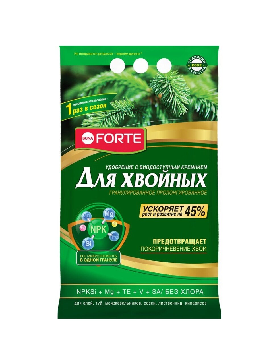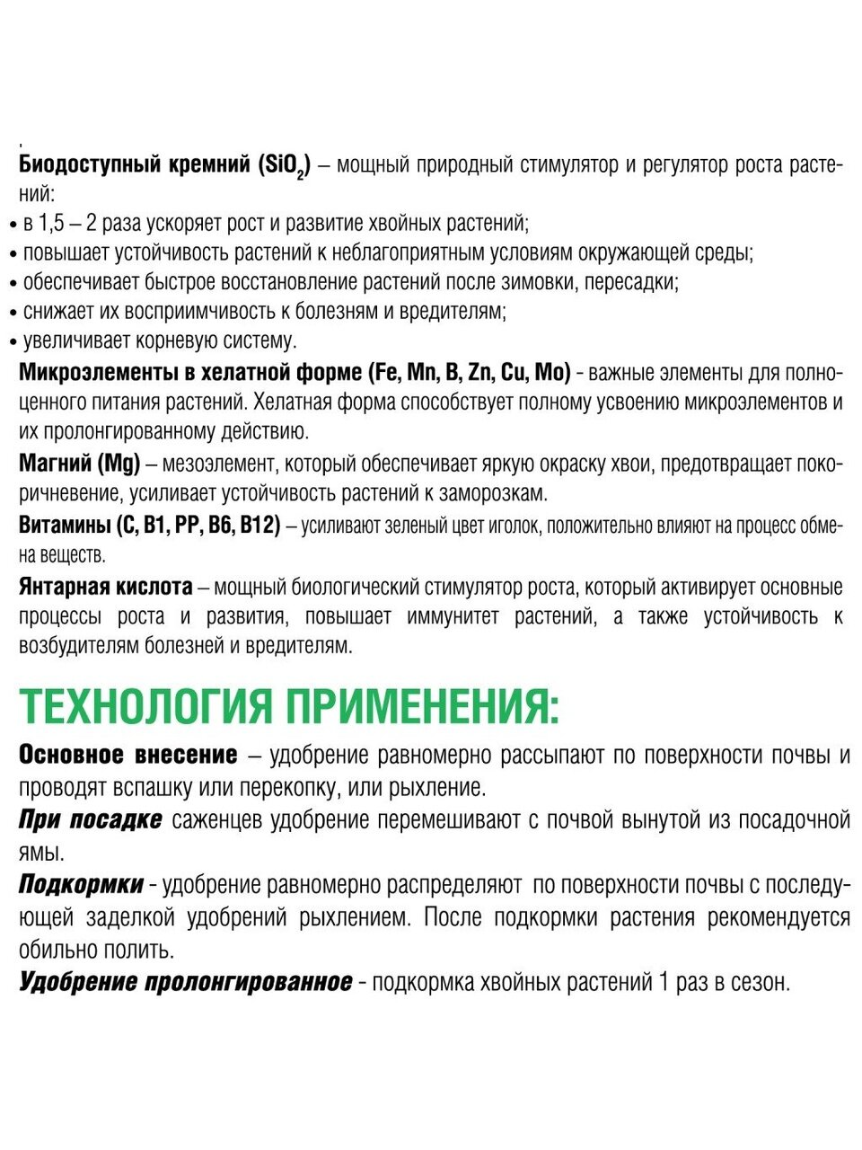 Гранулы легко вносятся в почву, не пылят и не вызывают раздражения кожи. Пролонгированное действие гарантирует постепенное поступление питательных веществ, что снижает риск передозировки и делает уход за растениями максимально простым. Уникальная формула с биодоступным кремнием укрепляет ткани хвои, предотвращает пожелтение и опадание иголок, а также способствует формированию плотной и здоровой кроны.