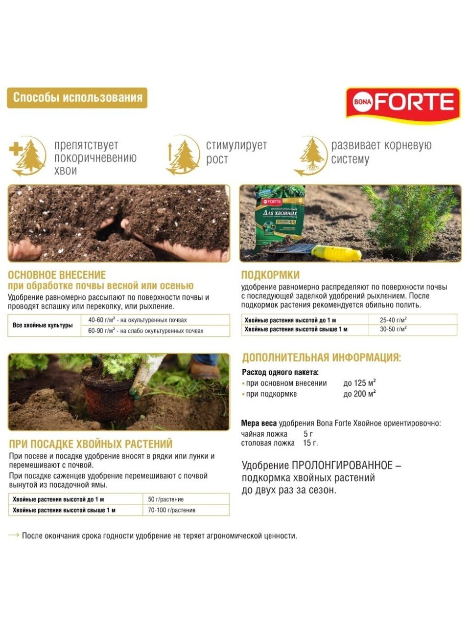 Минеральный состав специально подобран для удовлетворения всех потребностей хвойных культур, выращиваемых в открытом грунте. Применение удобрения стимулирует корнеобразование, ускоряет восстановление после зимы, повышает устойчивость к неблагоприятным погодным условиям и болезням. Продукт подходит для использования весной и осенью, что позволяет обеспечить растения необходимыми элементами в самые важные периоды вегетации.