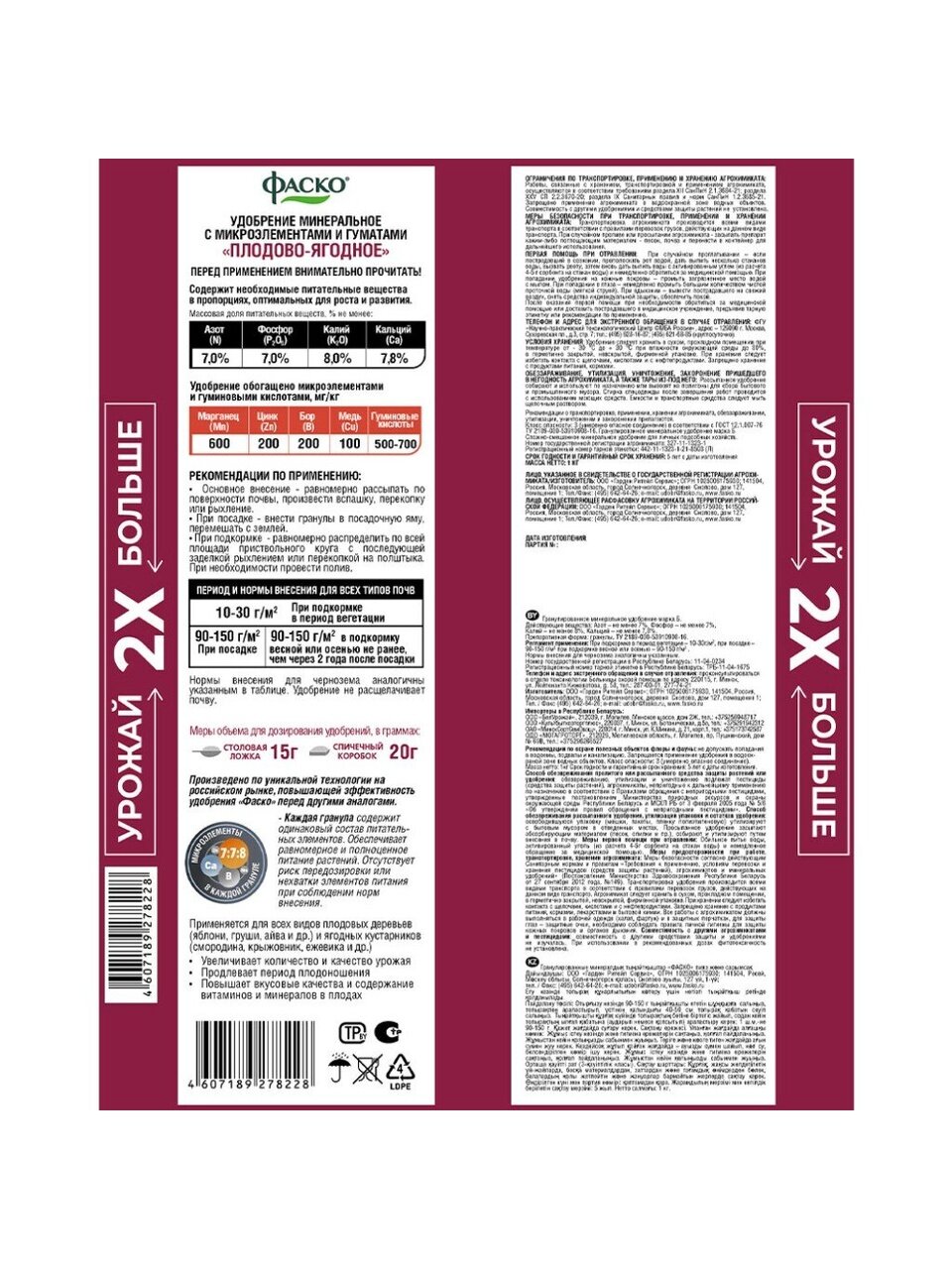 Удобрение 5М от бренда Фаско - идеальное решение для всех, кто стремится к богатому урожаю плодово-ягодных кустарников. Это минеральное удобрение в форме гранул обеспечивает эффективный рост растений и улучшает их здоровье в весенний сезон.
