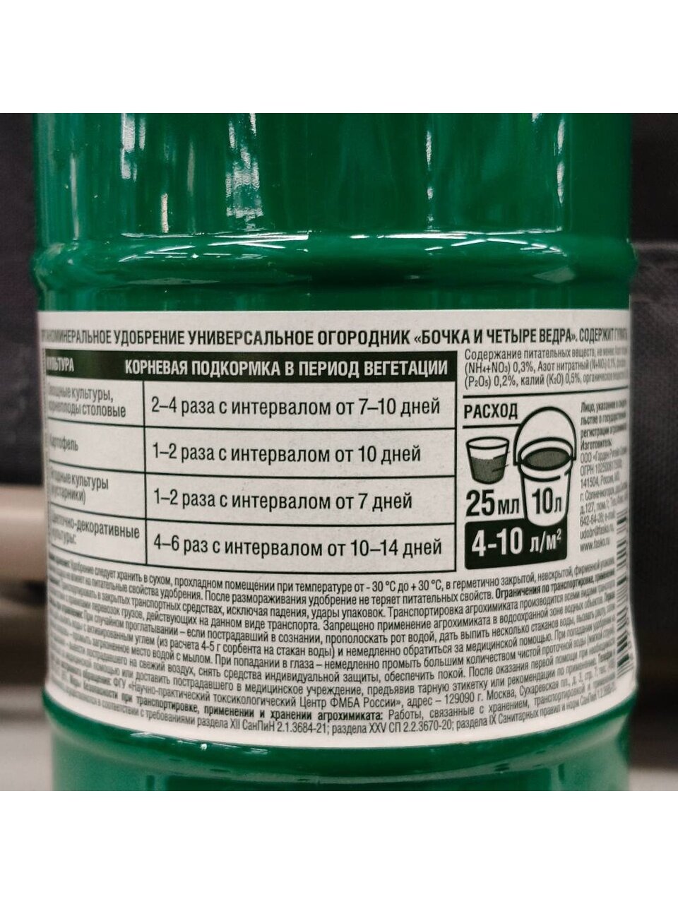 Представляем универсальное органоминеральное удобрение "Бочка и четыре ведра" от бренда Огородник! Это идеальное решение для тех, кто стремится к здоровому и активному росту растений в любое время года. Жидкая форма удобрения обеспечивает легкость в применении и быстрое усвоение питательных веществ.