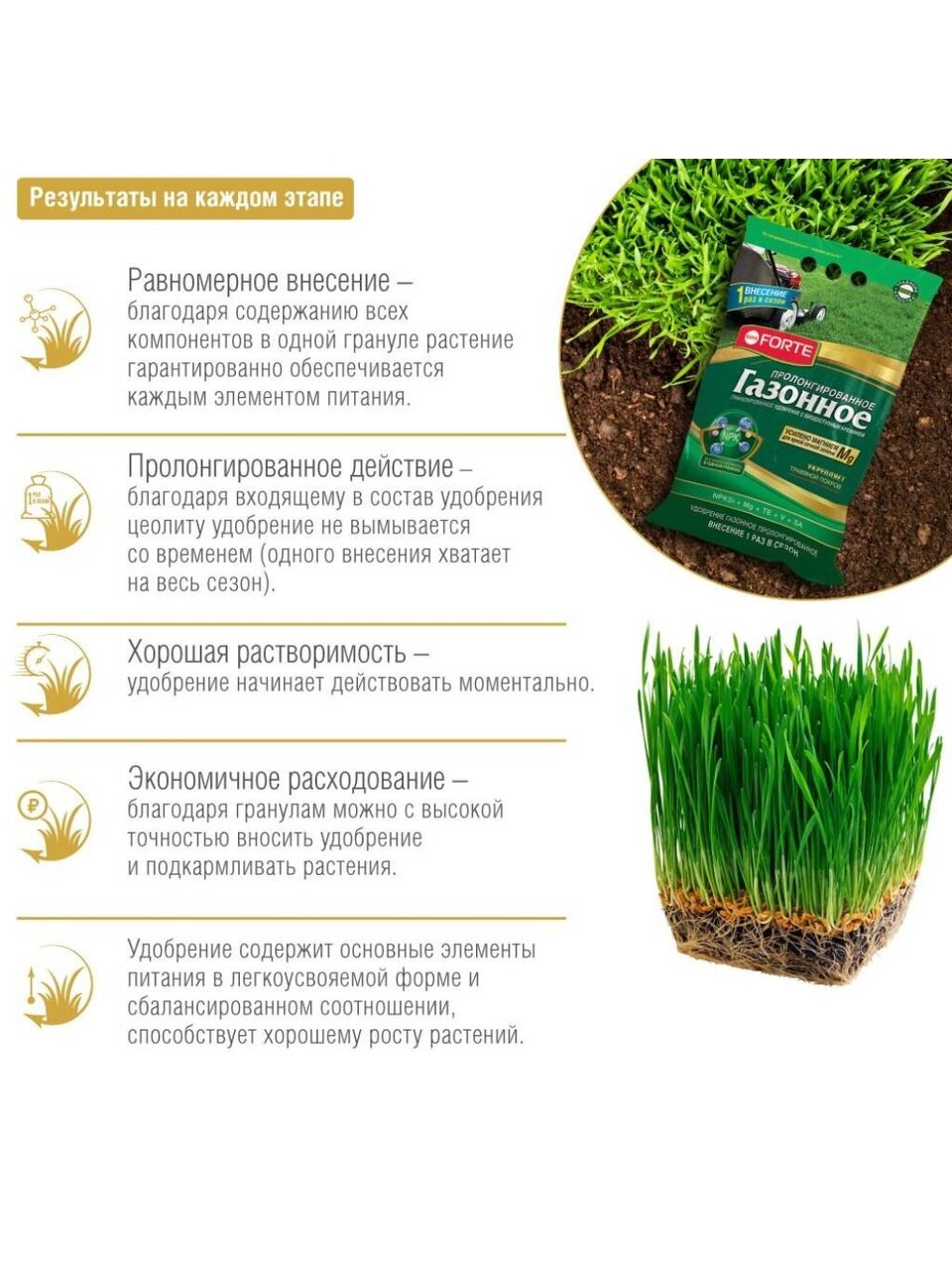 - Пролонгированное действие - благодаря входящему в состав удобрения цеолиту удобрение не вымывается со временем (одного внесения хватает на весь сезон).